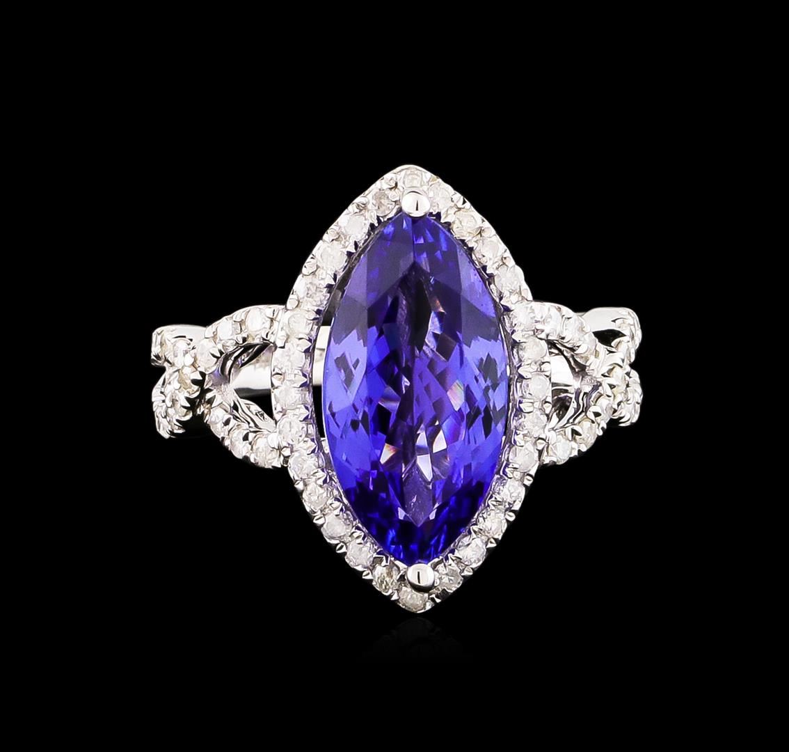 One electronically tested 14KT white gold Ladies cast ring with a bright polish finish. Condition is new. Identified with markings of "14K". Containing: One prong set marquise modified brilliant cut natural tanzanite, measuring 15.00 x 7.90 x 5.14mm, approximate weight of 3.88ct., clarity is eye clean, type I, medium, moderately strong, violet color, (GIA V 5/4), cut is good. Colored gemstones are presumed to have been subjected to commonly used color/clarity enhancement processes. Fifty-Nine prong set round brilliant cut diamonds, measuring 1.30 - 1.30 x 0.78mm (depth est.) approximate. Total Weight of 59 Stones = 0.47ct. Clarity: I-1 to I-3. Color: I - J, Cut is Good. All grading of diamonds and colored gemstones in this piece of jewelry are graded in the mounting, unless otherwise stated. Total Weight of Colored Stones 3.88ct. Total Weight of Diamonds 0.47ct. Total Weight of Ring 6.30 grams. GGL Appraised at $8,480.00.