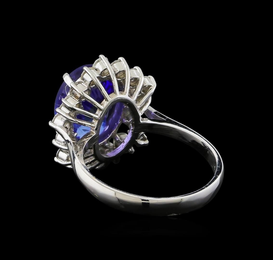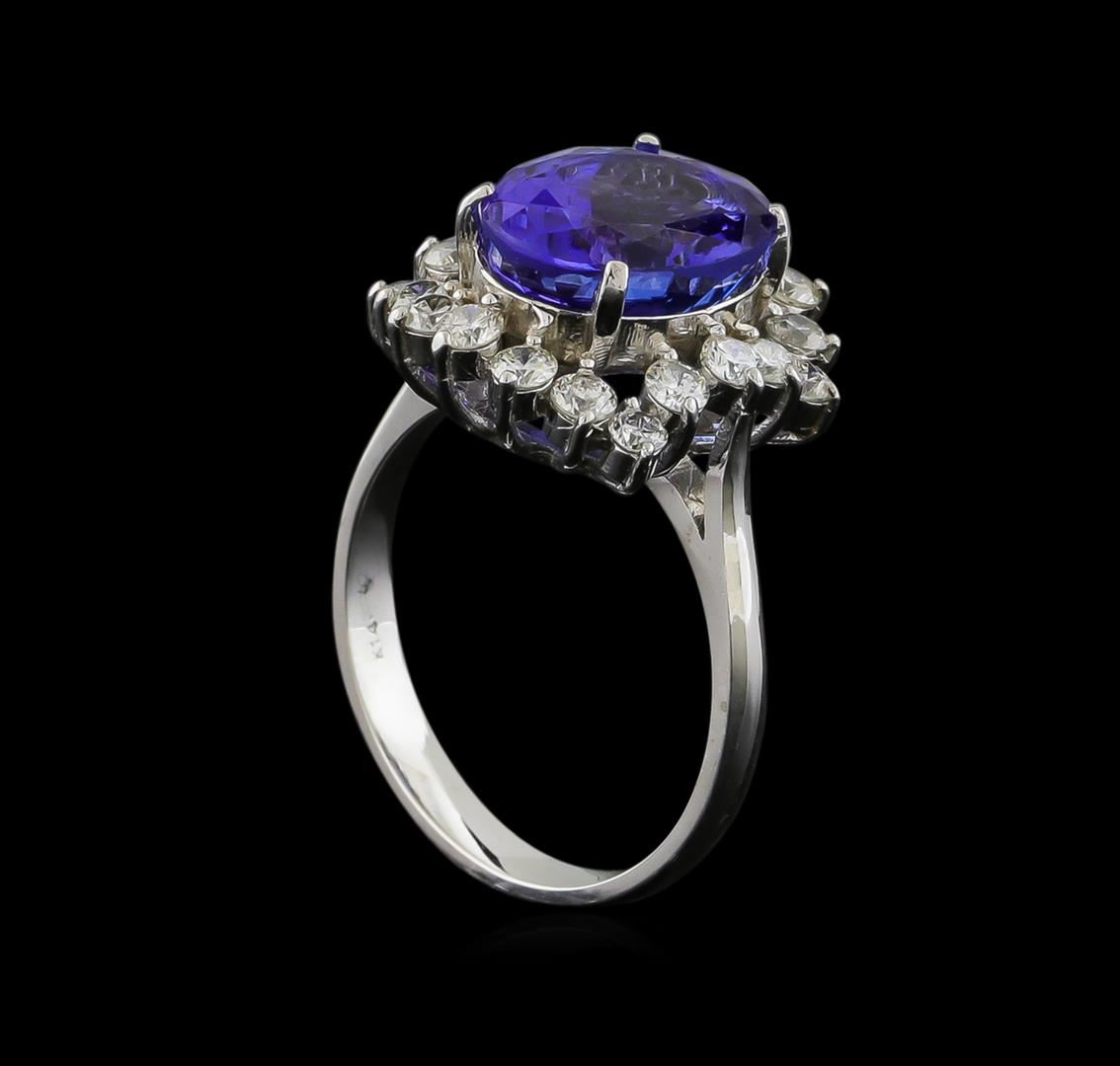 One electronically tested 14KT white gold ladies combination cast & assembled engagement ring with a bright polish finish. Identified with markings of "K14". Condition is new. Containing: One prong set oval modified brilliant cut natural tanzanite, measuring 11.10 x 8.90 x 5.79mm, approximate weight of 3.88ct., clarity is eye clean, type I, medium, moderately strong, bluish violet color, (GIA bV 5/4), cut is good. Twenty prong set round brilliant cut diamonds, measuring 2.20 - 1.80 x 1.20mm (depth est.) approximate total weight of 20 Stones = 0.58ct. Clarity: I-1. Color: I - J, Cut is Good. Colored gemstones are presumed to have been subjected to commonly used enhancement processes. All diamonds and colored gemstones are graded in the mounting, unless otherwise stated. Total Weight of Colored Stones 3.88ct. Total Weight of Diamonds 0.58ct. Total Weight of Ring 5.10 grams. GGL Appraised at $8,915.00.