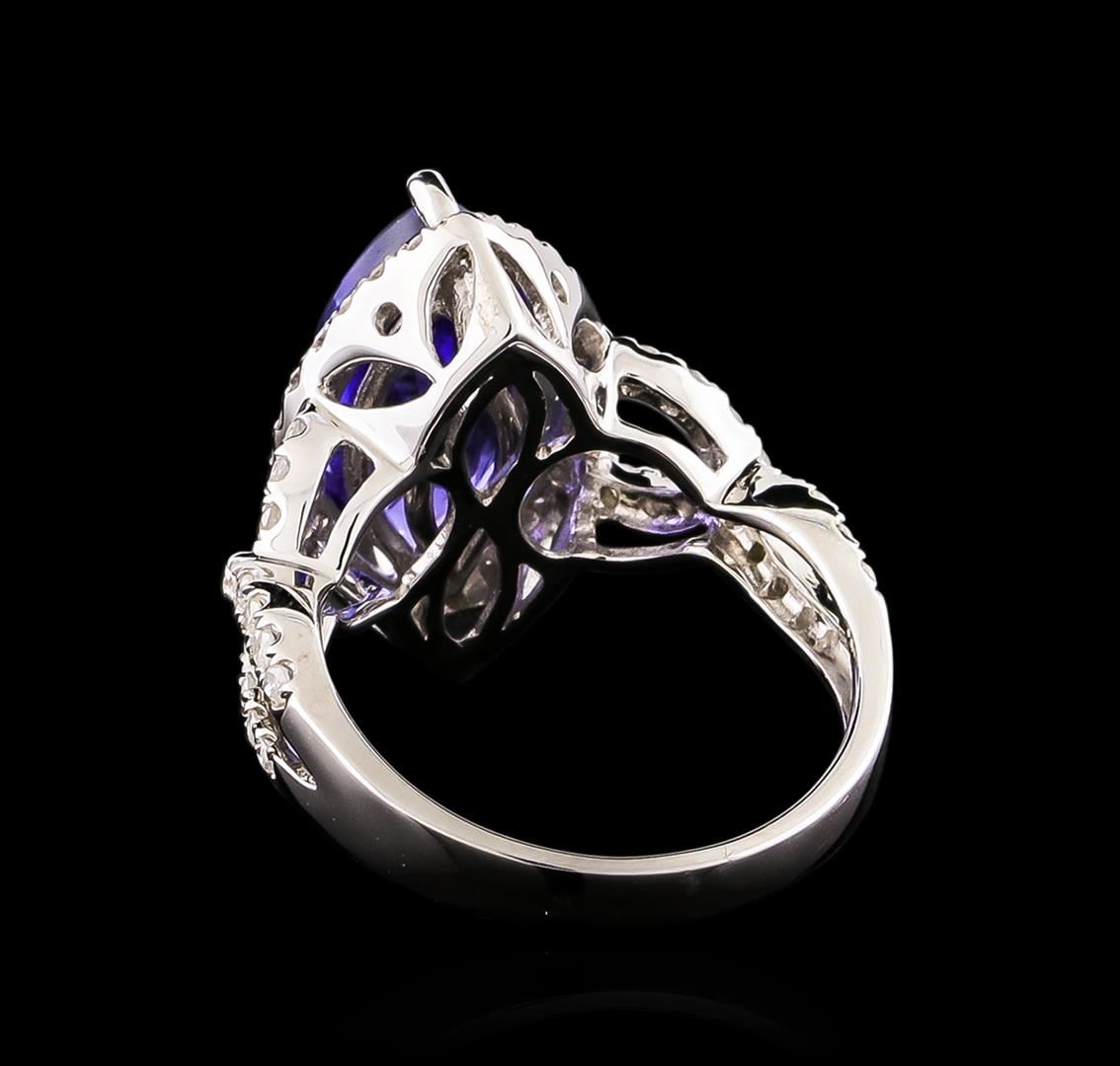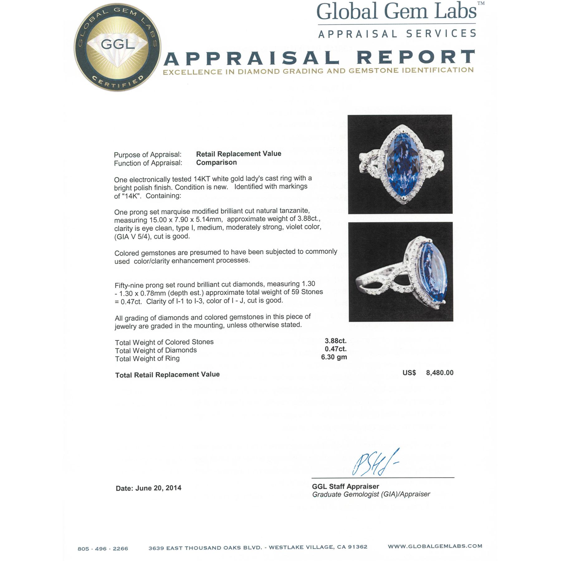 One electronically tested 14KT white gold Ladies cast ring with a bright polish finish. Condition is new. Identified with markings of "14K". Containing: One prong set marquise modified brilliant cut natural tanzanite, measuring 15.00 x 7.90 x 5.14mm, approximate weight of 3.88ct., clarity is eye clean, type I, medium, moderately strong, violet color, (GIA V 5/4), cut is good. Colored gemstones are presumed to have been subjected to commonly used color/clarity enhancement processes. Fifty-Nine prong set round brilliant cut diamonds, measuring 1.30 - 1.30 x 0.78mm (depth est.) approximate. Total Weight of 59 Stones = 0.47ct. Clarity: I-1 to I-3. Color: I - J, Cut is Good. All grading of diamonds and colored gemstones in this piece of jewelry are graded in the mounting, unless otherwise stated. Total Weight of Colored Stones 3.88ct. Total Weight of Diamonds 0.47ct. Total Weight of Ring 6.30 grams. GGL Appraised at $8,480.00.