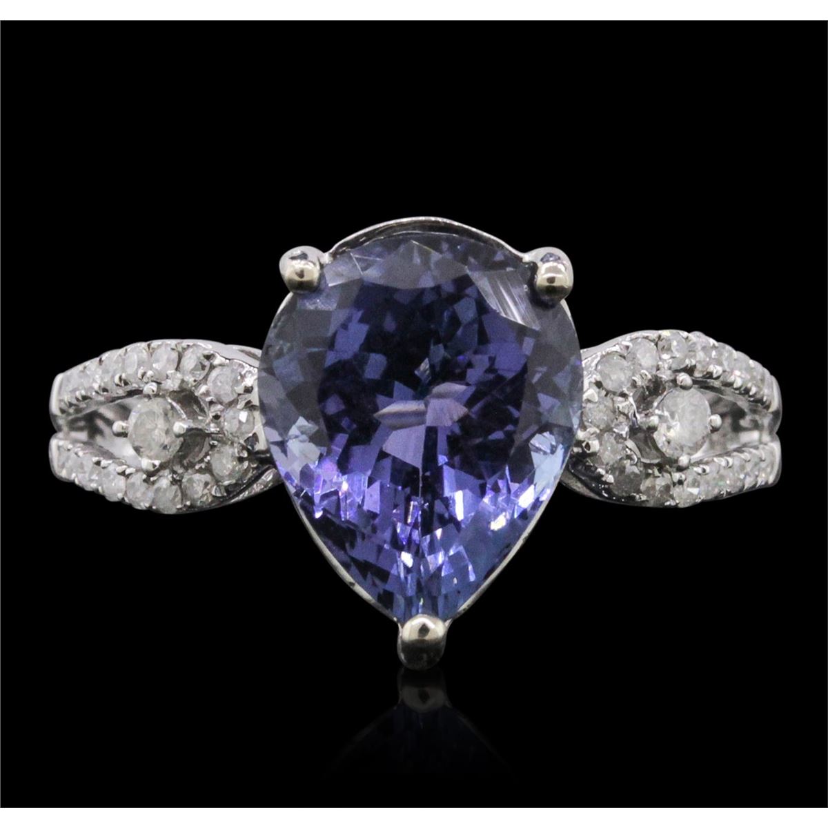 One electronically tested 14KT white gold ladies combination cast & assembled tanzanite and diamond ring with a split shank with a bright polish finish. Identified with markings of "14K". Condition is new. Containing: One prong set pear modified brilliant cut natural tanzanite, measuring 11.00 x 8.88 x 5.93mm, approximate weight of 3.88ct., clarity is eye clean, type I, medium, very slightly grayish, violet color, (GIA V 5/3), cut is good. Thirty-Six prong set round brilliant cut diamonds, measuring 1.50 - 1.20 x 0.81mm (depth est.) approximate total weight of 36 Stones = 0.20ct. Clarity: I-1 to I-2. Color: I - J, Cut is Good. Colored gemstones are presumed to have been subjected to commonly used enhancement processes. All diamonds and colored gemstones are graded in the mounting, unless otherwise stated. Total Weight of Colored Stones 3.88ct. Total Weight of Diamonds 0.20ct. Total Weight of Ring 3.30 grams. GGL Appraised at $6,895.00.