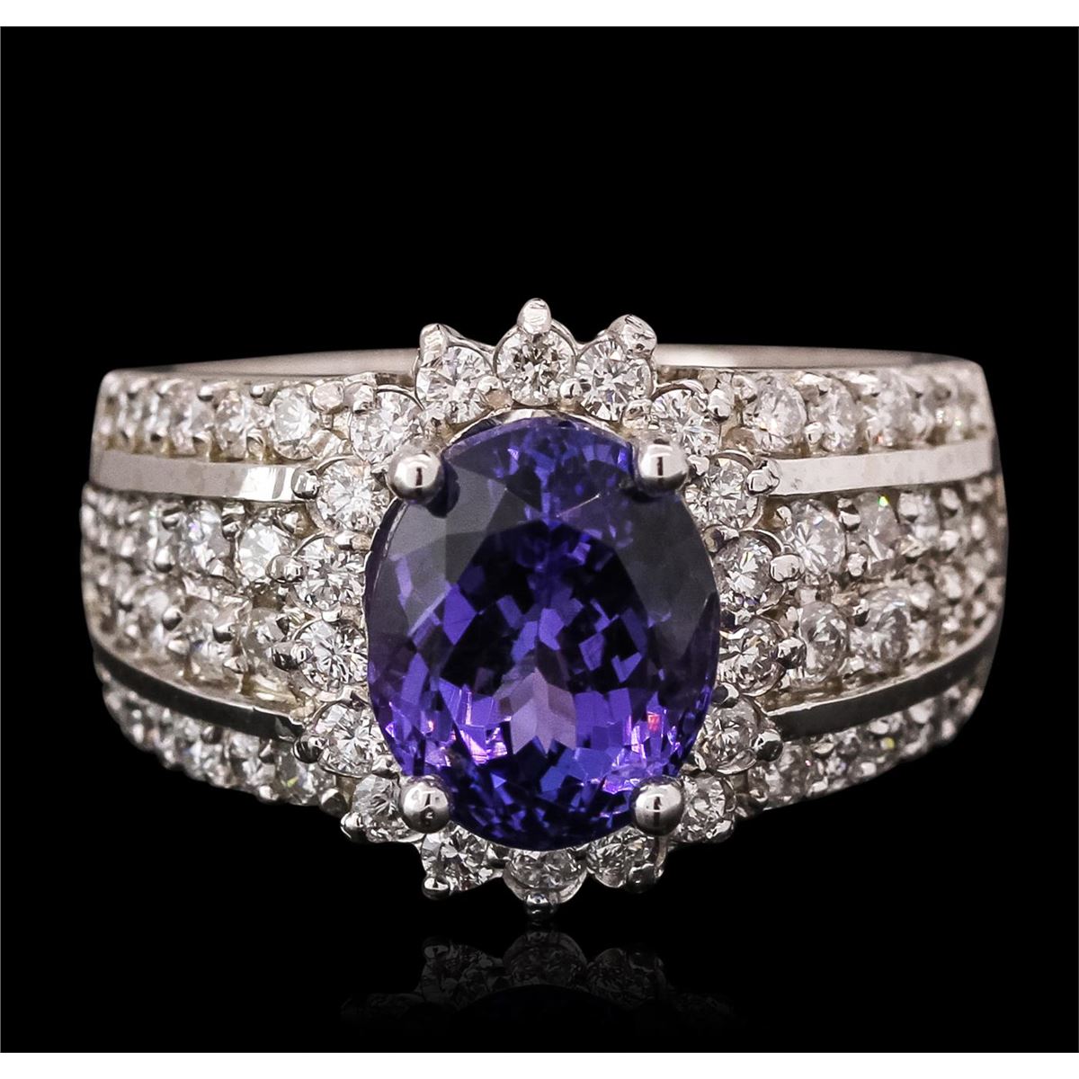 One electronically tested 14KT white gold ladies combination cast & assembled tanzanite and diamond ring with a flat shank with a bright polish finish. Identified with markings of "K14". Condition is new. Containing: One prong set oval modified brilliant cut natural tanzanite, measuring 10.08 x 8.10 x 7.00mm, approximate weight of 3.88ct., clarity is eye clean, type I, medium, moderately strong, violet color, (GIA V 5/4), cut is good. Fifty-Eight prong set round brilliant cut diamonds, measuring 1.90 - 1.80 x 1.11mm (depth est.) approximate total weight of 58 Stones = 1.34ct. Clarity: I-1 to I-2. Color: I - J, Cut is Good. Colored gemstones are presumed to have been subjected to commonly used enhancement processes. All diamonds and colored gemstones are graded in the mounting, unless otherwise stated. Total Weight of Colored Stones 3.88ct. Total Weight of Diamonds 1.34ct. Total Weight of Ring 10.90 grams. GGL Appraised at $10,745.00.