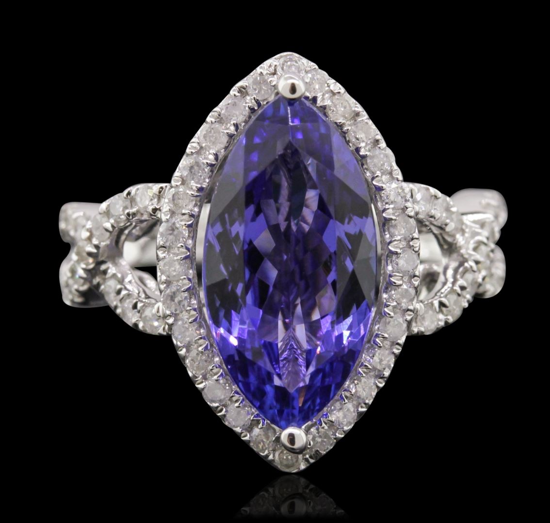 One electronically tested 14KT white gold Ladies cast ring with a bright polish finish. Condition is new. Identified with markings of "14K". Containing: One prong set marquise modified brilliant cut natural tanzanite, measuring 15.00 x 7.90 x 5.14mm, approximate weight of 3.88ct., clarity is eye clean, type I, medium, moderately strong, violet color, (GIA V 5/4), cut is good. Colored gemstones are presumed to have been subjected to commonly used color/clarity enhancement processes. Fifty-Nine prong set round brilliant cut diamonds, measuring 1.30 - 1.30 x 0.78mm (depth est.) approximate. Total Weight of 59 Stones = 0.47ct. Clarity: I-1 to I-3. Color: I - J, Cut is Good. All grading of diamonds and colored gemstones in this piece of jewelry are graded in the mounting, unless otherwise stated. Total Weight of Colored Stones 3.88ct. Total Weight of Diamonds 0.47ct. Total Weight of Ring 6.30 grams. GGL Appraised at $8,480.00.
