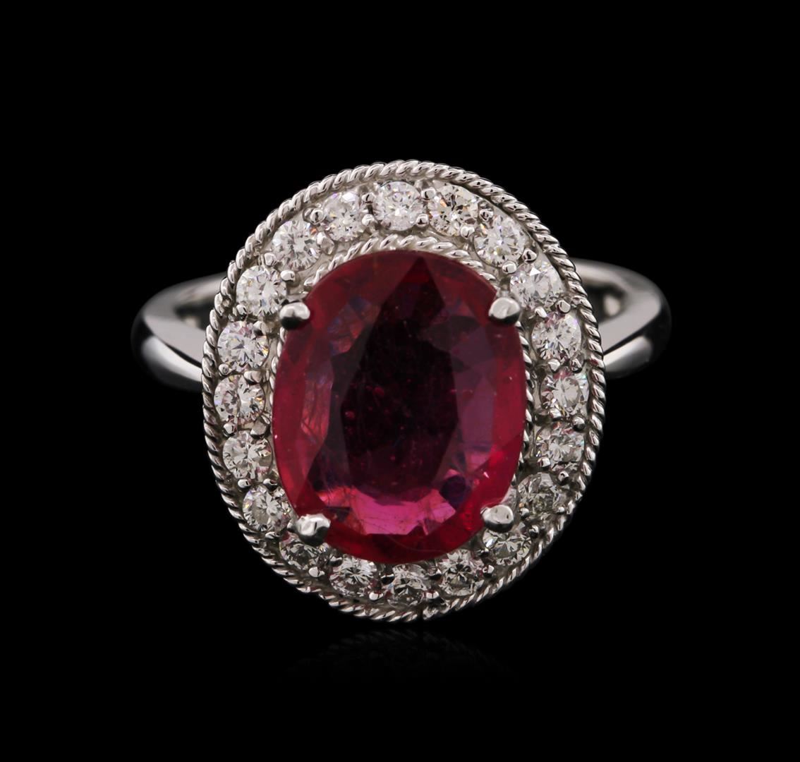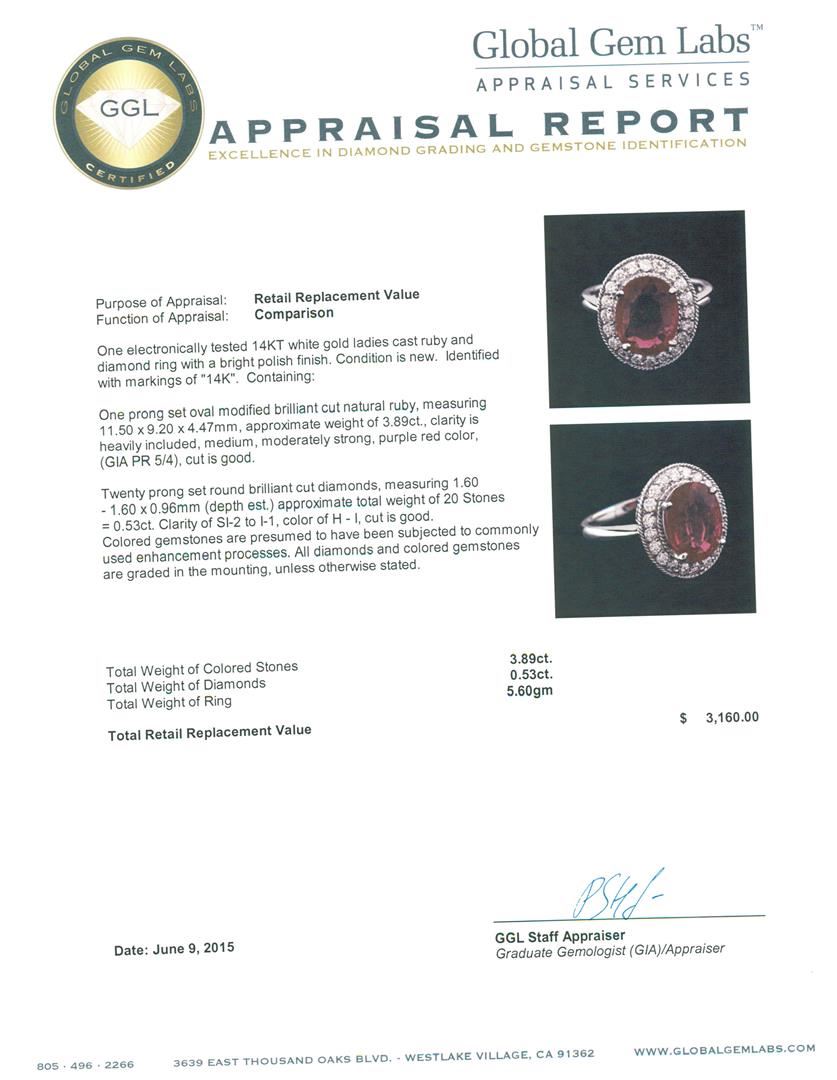 One electronically tested 14KT white gold ladies cast ruby and diamond ring with a bright polish finish. Identified with markings of "14K". Condition is new. Containing: One prong set oval modified brilliant cut natural ruby, measuring 11.50 x 9.20 x 4.47mm, approximate weight of 3.89ct., clarity is heavily included, medium, moderately strong, purple red color, (GIA PR 5/4), cut is good. Twenty prong set round brilliant cut diamonds, measuring 1.60 - 1.60 x 0.96mm (depth est.) approximate total weight of 20 Stones = 0.53ct. Clarity: SI-2 to I-1. Color: H - I, Cut is Good. Colored gemstones are presumed to have been subjected to commonly used enhancement processes. All diamonds and colored gemstones are graded in the mounting, unless otherwise stated. Total Weight of Colored Stones 3.89ct. Total Weight of Diamonds 0.53ct. Total Weight of Ring 5.60 grams. GGL Appraised at $3,160.00.