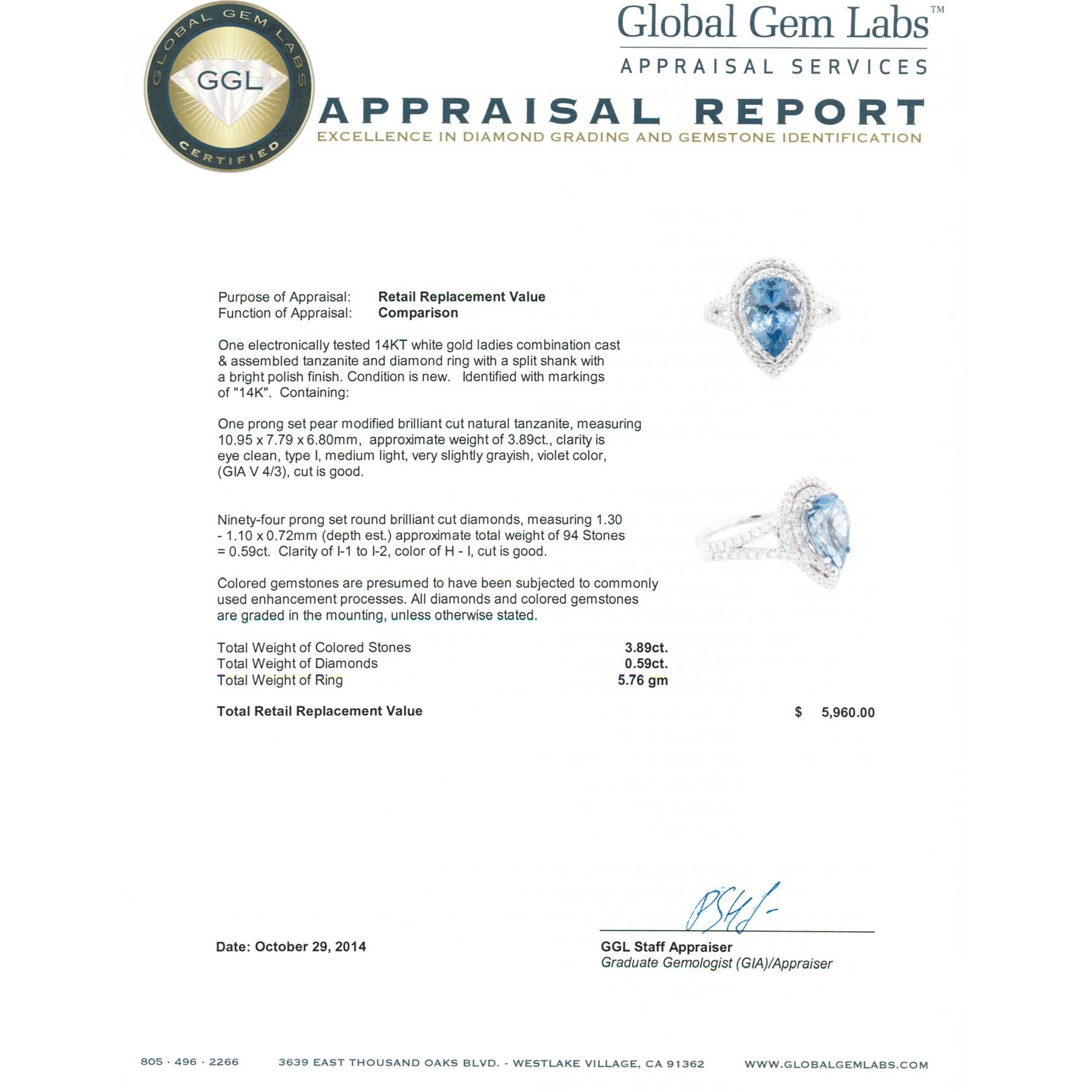 One electronically tested 14KT white gold ladies combination cast & assembled tanzanite and diamond ring with a split shank with a bright polish finish. Identified with markings of 14K. Condition is new. Containing: One prong set pear modified brilliant cut natural tanzanite, measuring 10.95 x 7.79 x 6.80mm, approximate weight of 3.89ct., clarity is eye clean, type I, medium light, very slightly grayish, violet color, (GIA V 4/3), cut is good. Ninety-Four prong set round brilliant cut diamonds, measuring 1.30 - 1.10 x 0.72mm (depth est.) approximate total weight of 94 Stones = 0.59ct. Clarity: I-1 to I-2. Color: H - I, Cut is Good. Colored gemstones are presumed to have been subjected to commonly used enhancement processes. All diamonds and colored gemstones are graded in the mounting, unless otherwise stated. Total Weight of Colored Stones 3.89ct. Total Weight of Diamonds 0.59ct. Total Weight of Ring 5.76 grams. GGL Appraised at $5,960.00.