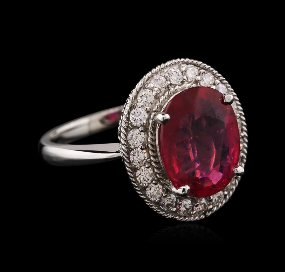 One electronically tested 14KT white gold ladies cast ruby and diamond ring with a bright polish finish. Identified with markings of "14K". Condition is new. Containing: One prong set oval modified brilliant cut natural ruby, measuring 11.50 x 9.20 x 4.47mm, approximate weight of 3.89ct., clarity is heavily included, medium, moderately strong, purple red color, (GIA PR 5/4), cut is good. Twenty prong set round brilliant cut diamonds, measuring 1.60 - 1.60 x 0.96mm (depth est.) approximate total weight of 20 Stones = 0.53ct. Clarity: SI-2 to I-1. Color: H - I, Cut is Good. Colored gemstones are presumed to have been subjected to commonly used enhancement processes. All diamonds and colored gemstones are graded in the mounting, unless otherwise stated. Total Weight of Colored Stones 3.89ct. Total Weight of Diamonds 0.53ct. Total Weight of Ring 5.60 grams. GGL Appraised at $3,160.00.