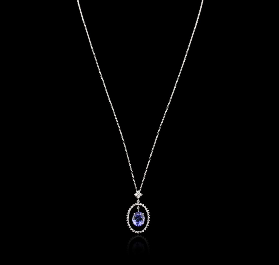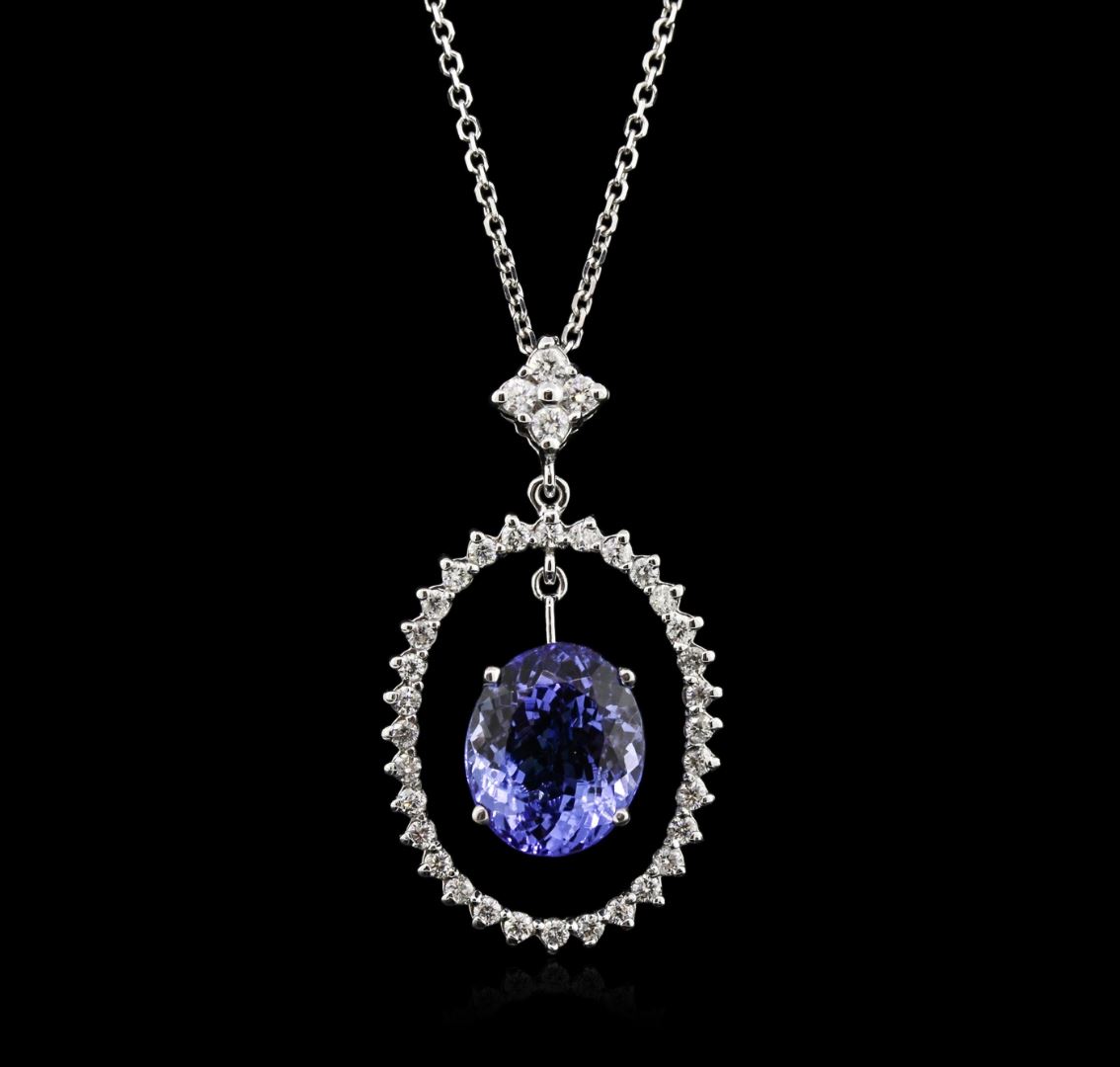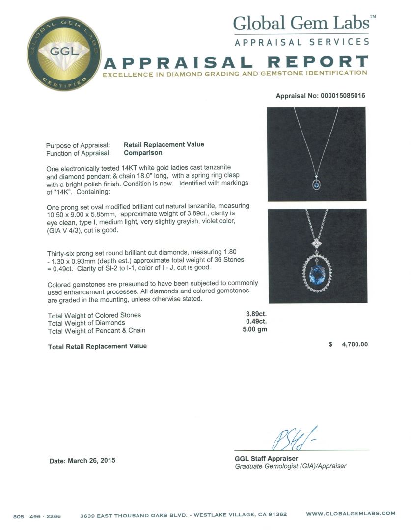 One electronically tested 14KT white gold ladies cast tanzanite and diamond pendant & chain 18.0" long, with a spring ring clasp with a bright polish finish. Identified with markings of "14K". Condition is new. Containing: One prong set oval modified brilliant cut natural tanzanite, measuring 10.50 x 9.00 x 5.85mm, approximate weight of 3.89ct., clarity is eye clean, type I, medium light, very slightly grayish, violet color, (GIA V 4/3), cut is good. Thirty-Six prong set round brilliant cut diamonds, measuring 1.80 - 1.30 x 0.93mm (depth est.) approximate total weight of 36 Stones = 0.49ct. Clarity: SI-2 to I-1. Color: I - J, Cut is Good. Colored gemstones are presumed to have been subjected to commonly used enhancement processes. All diamonds and colored gemstones are graded in the mounting, unless otherwise stated. Total Weight of Colored Stones 3.89ct. Total Weight of Diamonds 0.49ct. Total Weight of Pendant & Chain 5.00 grams. GGL Appraised at $4,780.00.