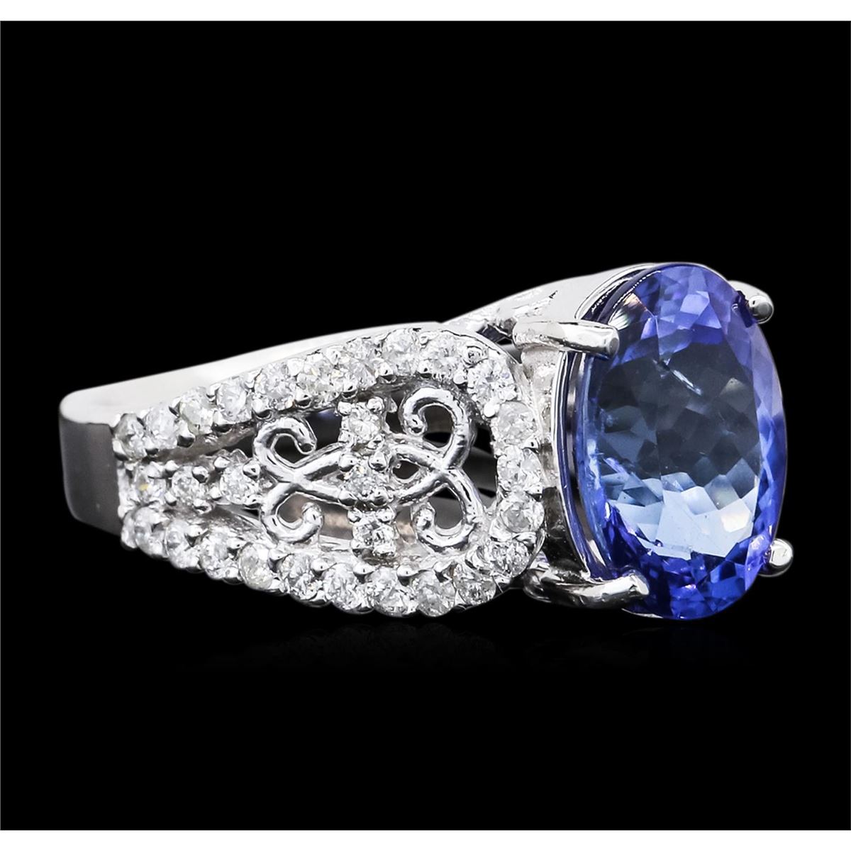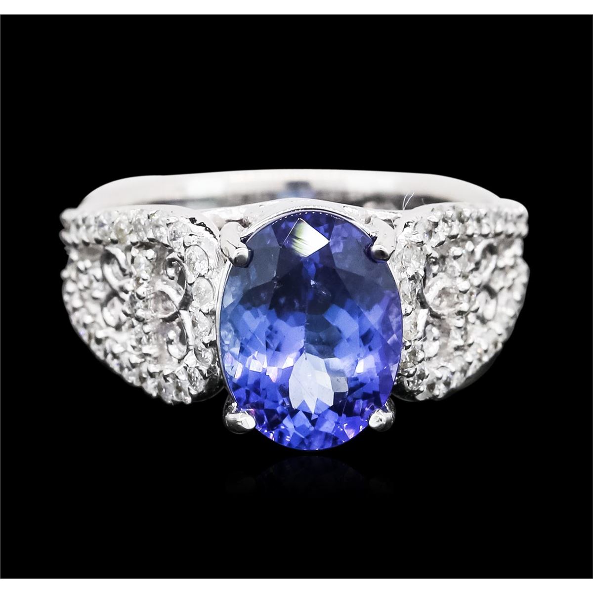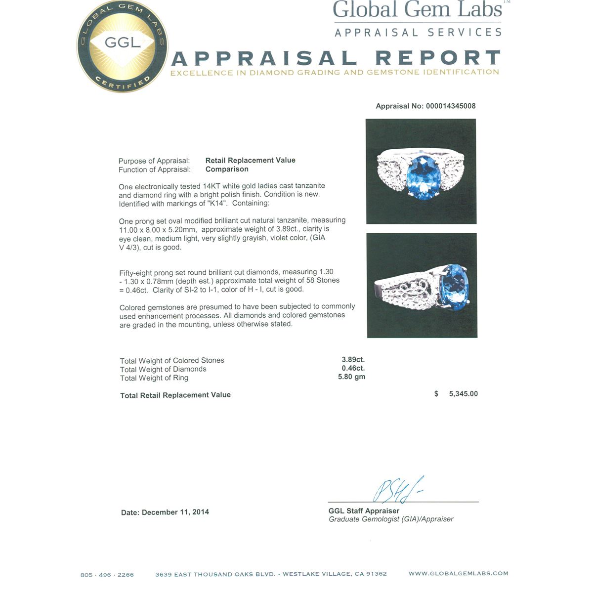 One electronically tested 14KT white gold ladies cast tanzanite and diamond ring with a bright polish finish. Identified with markings of "K14". Condition is new. Containing: One prong set oval modified brilliant cut natural tanzanite, measuring 11.00 x 8.00 x 5.20mm, approximate weight of 3.89ct., clarity is eye clean, medium light, very slightly grayish, violet color, (GIA V 4/3), cut is good. Fifty-Eight prong set round brilliant cut diamonds, measuring 1.30 - 1.30 x 0.78mm (depth est.) approximate total weight of 58 Stones = 0.46ct. Clarity: SI-2 to I-1. Color: H - I, Cut is Good. Colored gemstones are presumed to have been subjected to commonly used enhancement processes. All diamonds and colored gemstones are graded in the mounting, unless otherwise stated. Total Weight of Colored Stones 3.89ct. Total Weight of Diamonds 0.46ct. Total Weight of Ring 5.80 grams. GGL Appraised at $5,345.00.