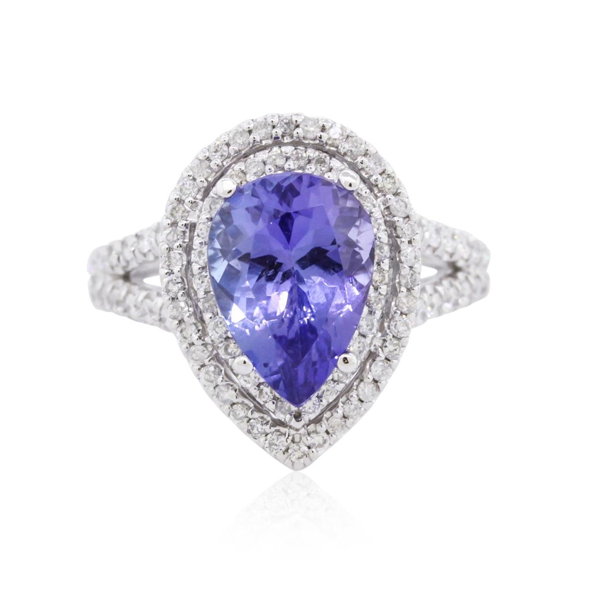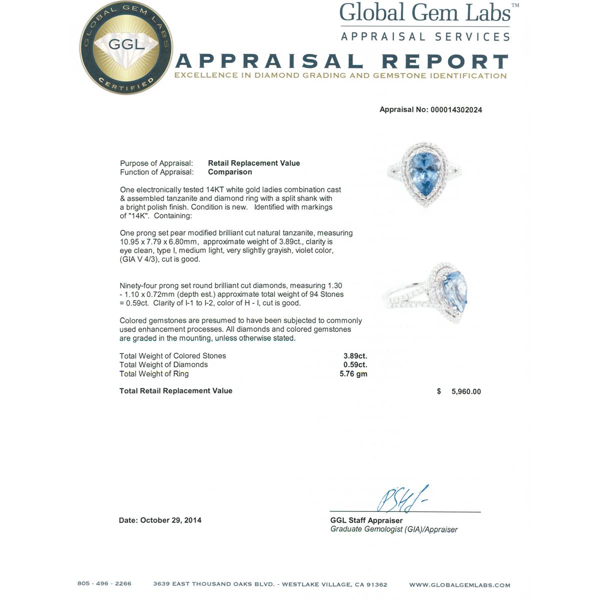 One electronically tested 14KT white gold ladies combination cast & assembled tanzanite and diamond ring with a split shank with a bright polish finish. Identified with markings of 14K. Condition is new. Containing: One prong set pear modified brilliant cut natural tanzanite, measuring 10.95 x 7.79 x 6.80mm, approximate weight of 3.89ct., clarity is eye clean, type I, medium light, very slightly grayish, violet color, (GIA V 4/3), cut is good. Ninety-Four prong set round brilliant cut diamonds, measuring 1.30 - 1.10 x 0.72mm (depth est.) approximate total weight of 94 Stones = 0.59ct. Clarity: I-1 to I-2. Color: H - I, Cut is Good. Colored gemstones are presumed to have been subjected to commonly used enhancement processes. All diamonds and colored gemstones are graded in the mounting, unless otherwise stated. Total Weight of Colored Stones 3.89ct. Total Weight of Diamonds 0.59ct. Total Weight of Ring 5.76 grams. GGL Appraised at $5,960.00.
