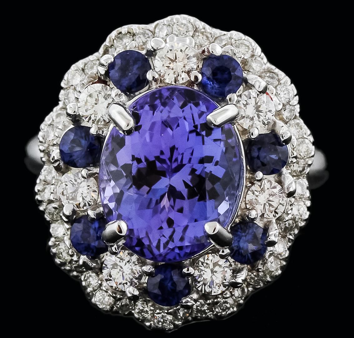 One electronically tested 14KT white gold ladies cast tanzanite, sapphire and diamond ring with a bright polish finish. Identified with markings of "K14". Condition is new. Containing: One prong set oval modified brilliant cut natural tanzanite, measuring 11.00 x 8.80 x 5.72mm, approximate weight of 3.90ct., clarity is eye clean, type I, medium light, very slightly grayish, violet color, (GIA V 4/3), cut is good. Seven prong set round modified brilliant cut natural blue sapphires, measuring 2.50 - 2.50 x 1.63 mm, approximate. Total Weight of 0.56ct., clarity is eye clean, type II, medium light, moderately strong, blue color, (GIA B 4/4), cut is good. Seven prong set round brilliant cut diamonds, measuring 2.50 - 2.50 x 1.50mm (depth est.) approximate. Total Weight of 7 Stones = 0.40ct. Clarity: SI-1. Color: J, Cut is Good. Forty-Two prong set round brilliant cut diamonds, measuring 1.30 - 1.30 x 0.78mm (depth est.) approximate. Total Weight of 42 Stones = 0.34ct. Clarity: SI-2. Color: I - J, Cut is Good. Colored gemstones are presumed to have been subjected to commonly used enhancement processes. All diamonds and colored gemstones are graded in the mounting, unless otherwise stated. Total Weight of Colored Stones 4.46ct. Total Weight of Diamonds 0.74ct. Total Weight of Ring 8.30 grams. GGL Appraised at $5,065.00.