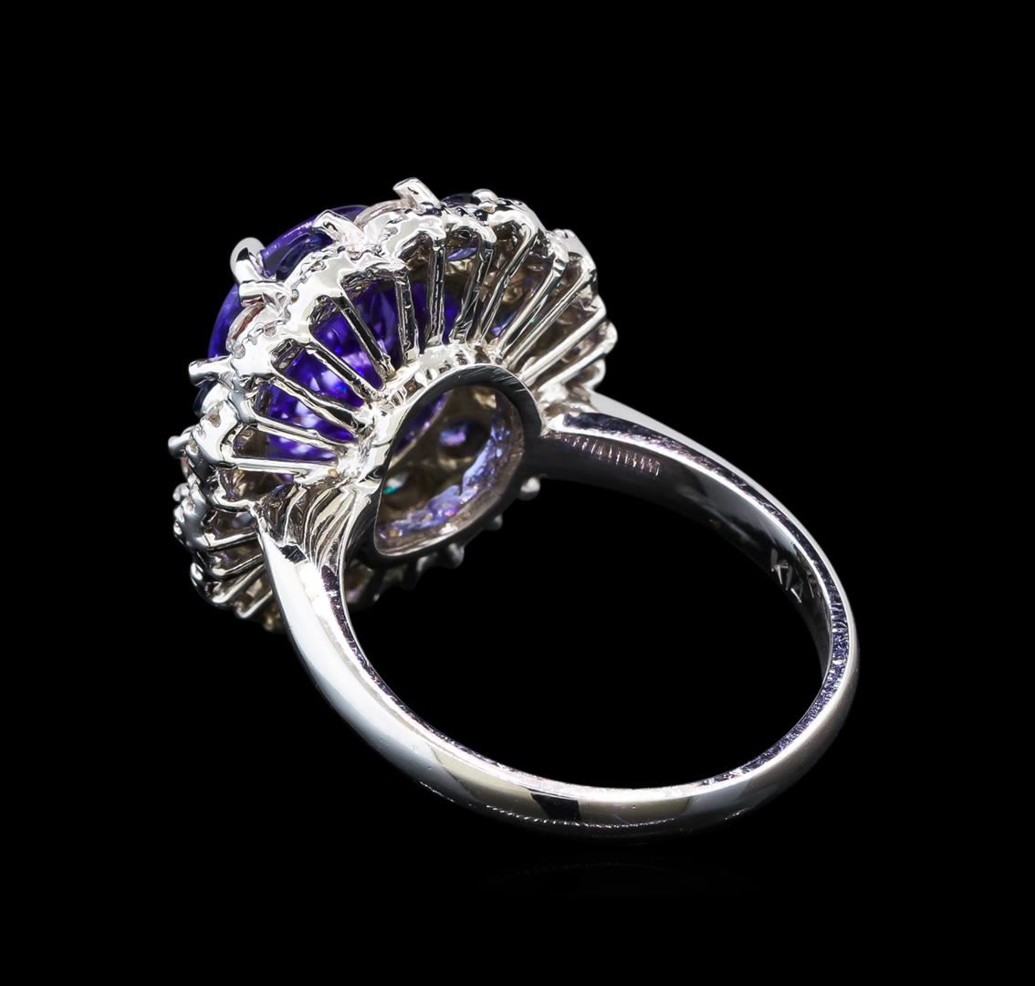 One electronically tested 14KT white gold ladies cast tanzanite, sapphire and diamond ring with a bright polish finish. Identified with markings of "K14". Condition is new. Containing: One prong set oval modified brilliant cut natural tanzanite, measuring 11.00 x 8.80 x 5.72mm, approximate weight of 3.90ct., clarity is eye clean, type I, medium light, very slightly grayish, violet color, (GIA V 4/3), cut is good. Seven prong set round modified brilliant cut natural blue sapphires, measuring 2.50 - 2.50 x 1.63 mm, approximate. Total Weight of 0.56ct., clarity is eye clean, type II, medium light, moderately strong, blue color, (GIA B 4/4), cut is good. Seven prong set round brilliant cut diamonds, measuring 2.50 - 2.50 x 1.50mm (depth est.) approximate. Total Weight of 7 Stones = 0.40ct. Clarity: SI-1. Color: J, Cut is Good. Forty-Two prong set round brilliant cut diamonds, measuring 1.30 - 1.30 x 0.78mm (depth est.) approximate. Total Weight of 42 Stones = 0.34ct. Clarity: SI-2. Color: I - J, Cut is Good. Colored gemstones are presumed to have been subjected to commonly used enhancement processes. All diamonds and colored gemstones are graded in the mounting, unless otherwise stated. Total Weight of Colored Stones 4.46ct. Total Weight of Diamonds 0.74ct. Total Weight of Ring 8.30 grams. GGL Appraised at $5,065.00.