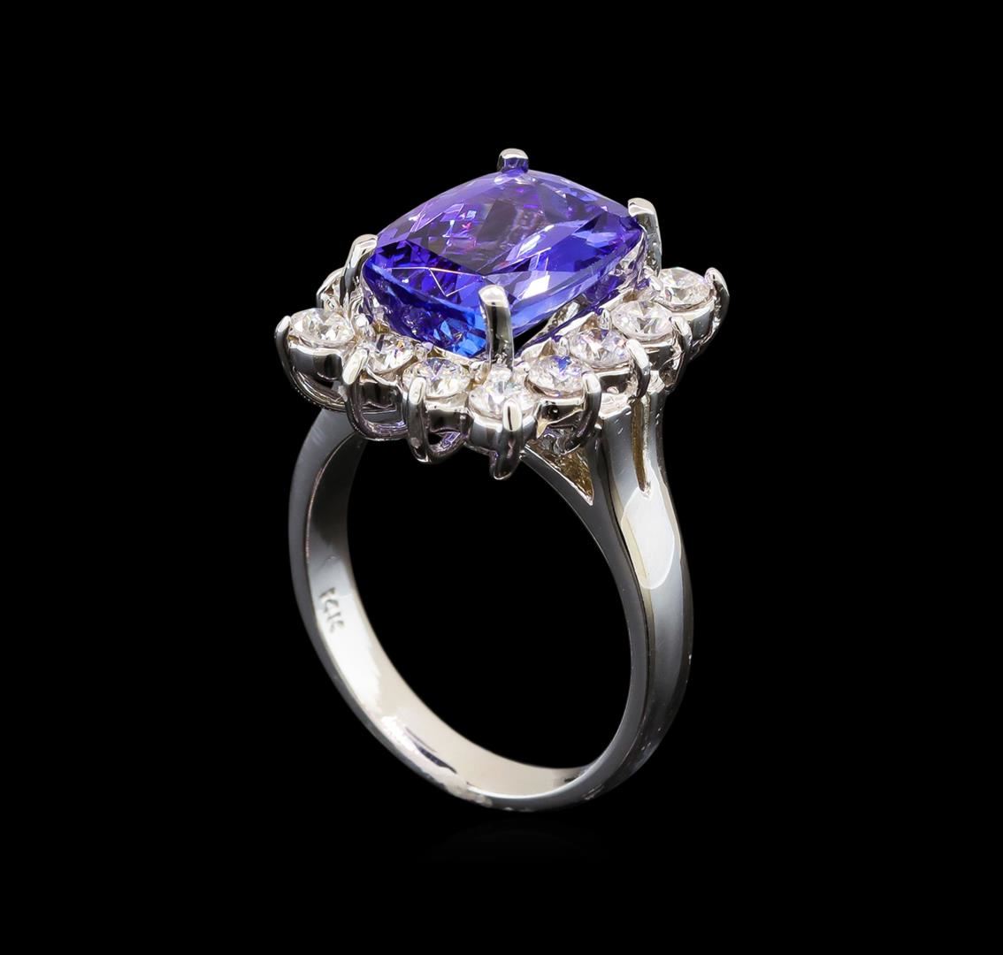 One electronically tested 14KT white gold ladies cast tanzanite and diamond ring with a bright polish finish. Identified with markings of "14K". Condition is new. Containing: One prong set rectangular cushion modified brilliant cut natural tanzanite, measuring 11.30 x 8.20 x 5.34mm, approximate weight of 3.90ct., clarity is eye clean, type I, medium, very slightly grayish, bluish violet color, (GIA bV 5/3), cut is very good. Fourteen prong set round brilliant cut diamonds, measuring 2.80 - 2.80 x 1.68mm (depth est.) approximate total weight of 14 Stones = 1.12ct. Clarity: SI-1 to I-1. Color: I - J, Cut is Good. Colored gemstones are presumed to have been subjected to commonly used enhancement processes. All diamonds and colored gemstones are graded in the mounting, unless otherwise stated. Total Weight of Colored Stones 3.90ct. Total Weight of Diamonds 1.12ct. Total Weight of Ring 6.60 grams. GGL Appraised at $5,455.00.