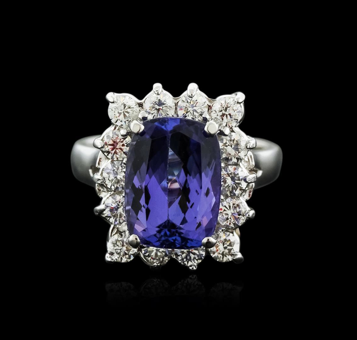 One electronically tested 14KT white gold ladies cast tanzanite and diamond ring with a bright polish finish. Identified with markings of "14K". Condition is new. Containing: One prong set rectangular cushion modified brilliant cut natural tanzanite, measuring 11.30 x 8.20 x 5.34mm, approximate weight of 3.90ct., clarity is eye clean, type I, medium, very slightly grayish, bluish violet color, (GIA bV 5/3), cut is very good. Fourteen prong set round brilliant cut diamonds, measuring 2.80 - 2.80 x 1.68mm (depth est.) approximate total weight of 14 Stones = 1.12ct. Clarity: SI-1 to I-1. Color: I - J, Cut is Good. Colored gemstones are presumed to have been subjected to commonly used enhancement processes. All diamonds and colored gemstones are graded in the mounting, unless otherwise stated. Total Weight of Colored Stones 3.90ct. Total Weight of Diamonds 1.12ct. Total Weight of Ring 6.60 grams. GGL Appraised at $5,455.00.