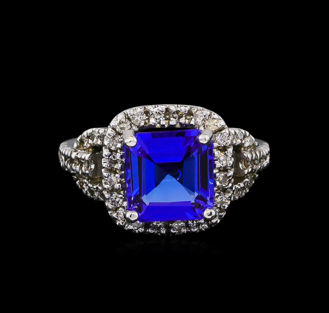 One electronically tested 14KT white gold Ladies combination cast & assembled ring with a bright polish finish. Condition is new. Identified with markings of "14K". Containing: One prong set emerald standard step cut natural tanzanite, measuring 9.30 x 9.30 x 5.00mm, approximate weight of 3.91ct., clarity is eye clean, type I, medium, moderately strong, bluish violet color, (GIA bV 5/4), cut is very good. Colored gemstones are presumed to have been subjected to commonly used color/clarity enhancement processes. Forty-Three prong set round brilliant cut diamonds, measuring 1.30 - 1.30 x 0.78mm (depth est.) approximate. Total Weight of 43 Stones = 0.34ct. Clarity: I-1 to I-2. Color: J - K, Cut is Good. Total Weight of Colored Stones 3.91ct. Total Weight of Diamonds 0.34ct. Total Weight of Ring 8.40 grams. GGL Appraised at $8,920.00.