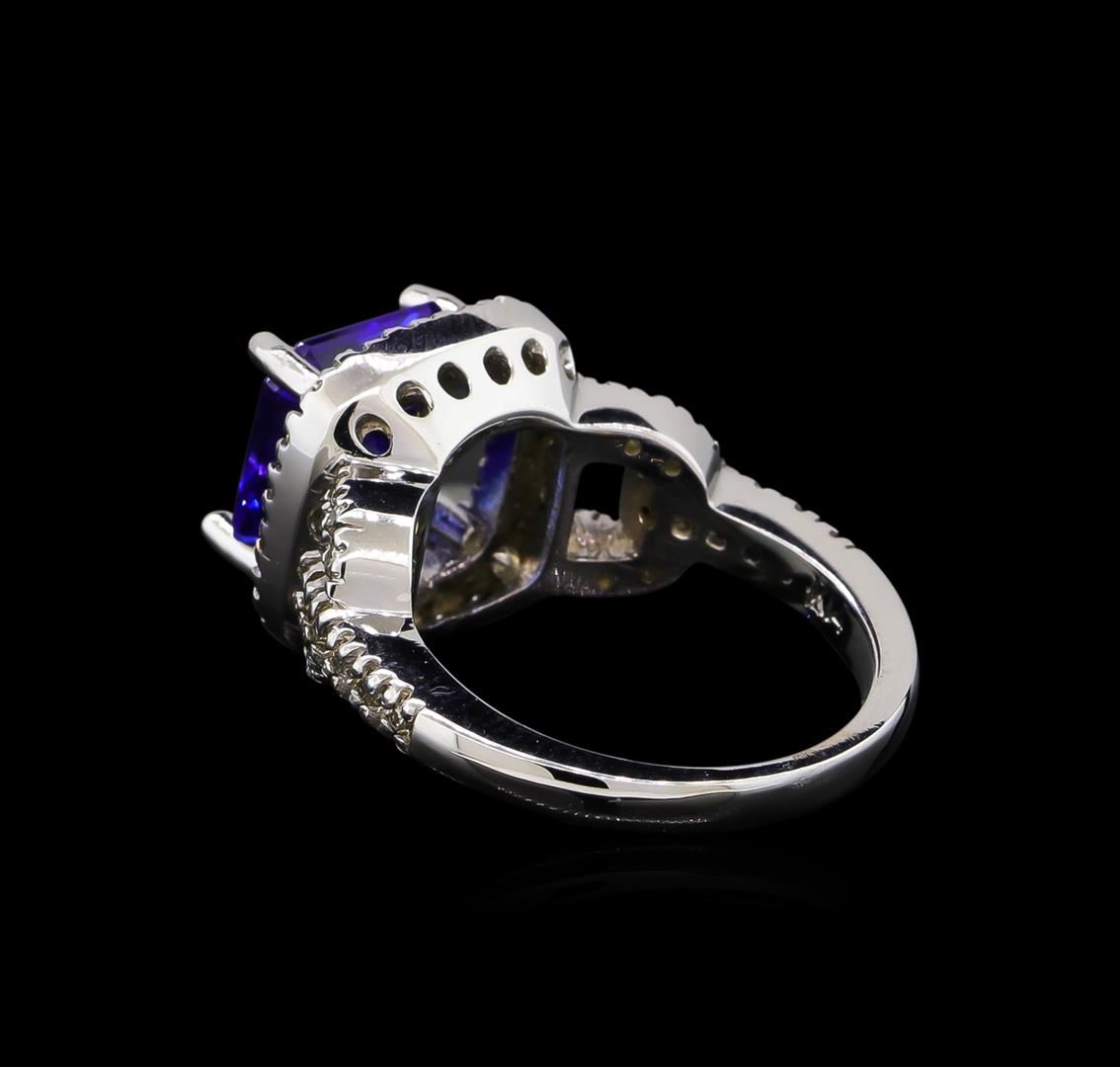 One electronically tested 14KT white gold Ladies combination cast & assembled ring with a bright polish finish. Condition is new. Identified with markings of "14K". Containing: One prong set emerald standard step cut natural tanzanite, measuring 9.30 x 9.30 x 5.00mm, approximate weight of 3.91ct., clarity is eye clean, type I, medium, moderately strong, bluish violet color, (GIA bV 5/4), cut is very good. Colored gemstones are presumed to have been subjected to commonly used color/clarity enhancement processes. Forty-Three prong set round brilliant cut diamonds, measuring 1.30 - 1.30 x 0.78mm (depth est.) approximate. Total Weight of 43 Stones = 0.34ct. Clarity: I-1 to I-2. Color: J - K, Cut is Good. Total Weight of Colored Stones 3.91ct. Total Weight of Diamonds 0.34ct. Total Weight of Ring 8.40 grams. GGL Appraised at $8,920.00.
