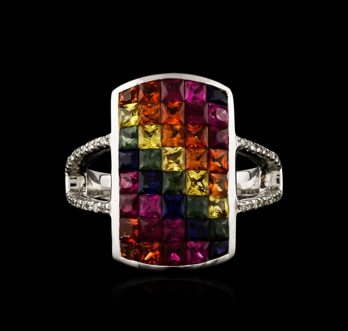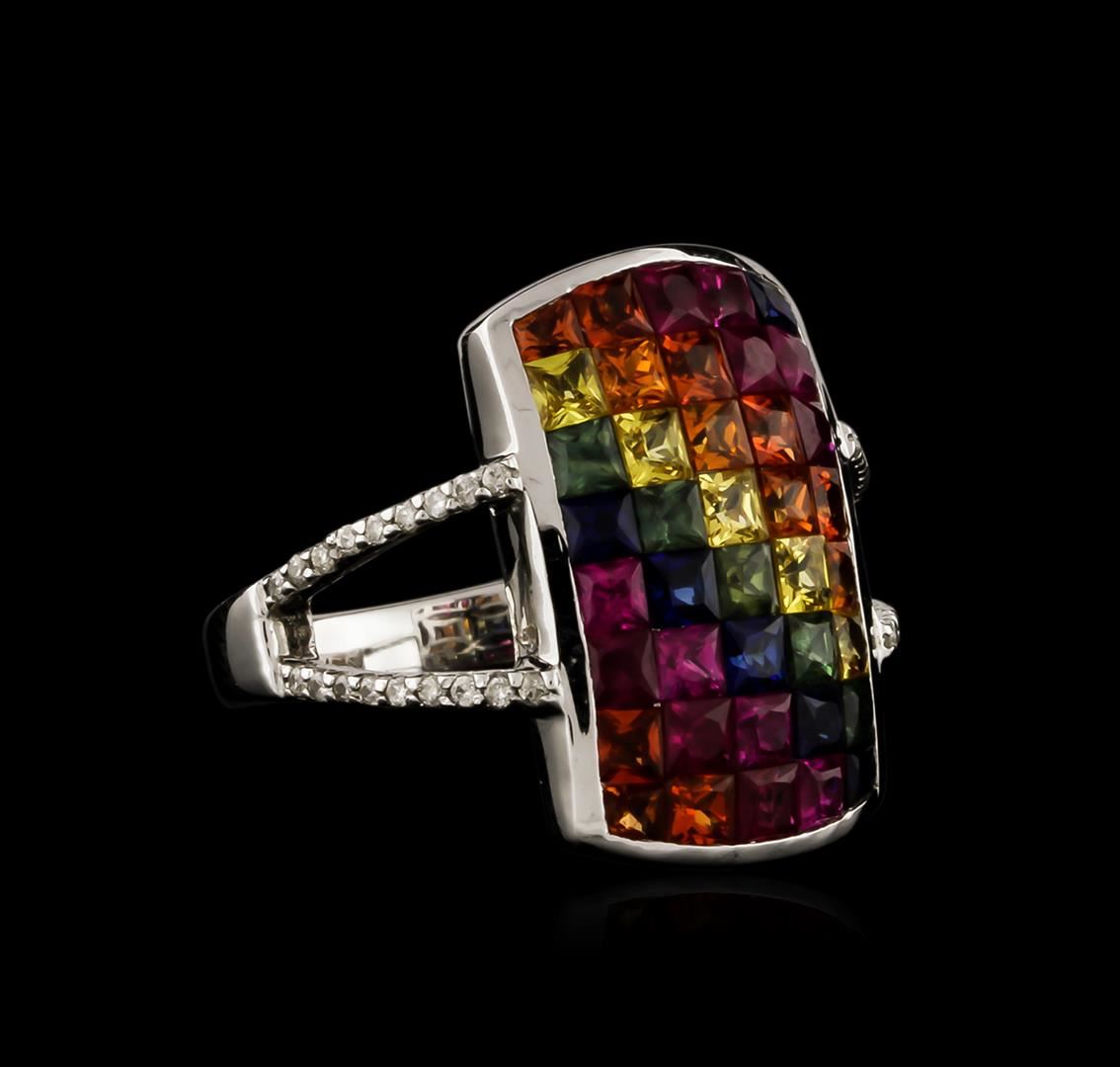 One ring featuring: 14KT white gold weighing 7.10 grams containing multicolor sapphires with a total weight of 3.91ct and prong set round diamonds with a total weight of 0.14ct.