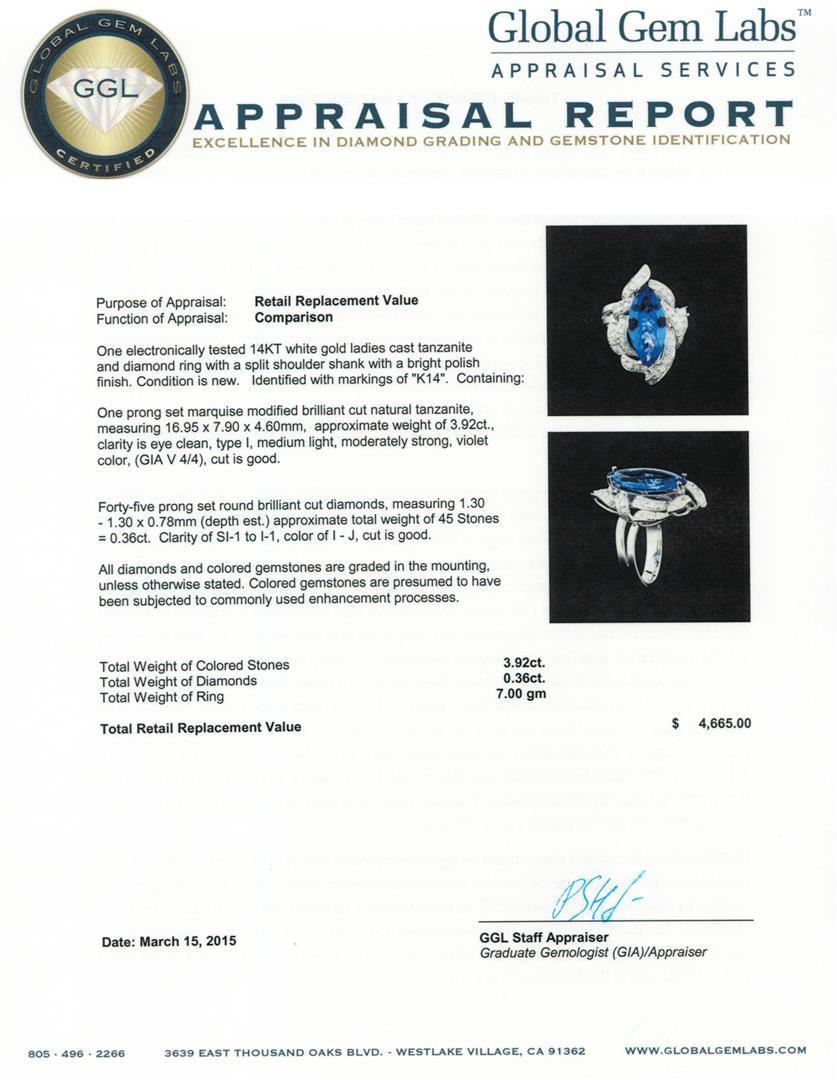 One electronically tested 14KT white gold ladies cast tanzanite and diamond ring with a split shoulder shank with a bright polish finish. Identified with markings of "K14". Condition is new. Containing: One prong set marquise modified brilliant cut natural tanzanite, measuring 16.95 x 7.90 x 4.60mm, approximate weight of 3.92ct., clarity is eye clean, type I, medium light, moderately strong, violet color, (GIA V 4/4), cut is good. Forty-Five prong set round brilliant cut diamonds, measuring 1.30 - 1.30 x 0.78mm (depth est.) approximate total weight of 45 Stones = 0.36ct. Clarity of SI-1 to I-1, Color of I - J, Cut is Good. All diamonds and colored gemstones are graded in the mounting, unless otherwise stated. Colored gemstones are presumed to have been subjected to commonly used enhancement processes. Total Weight of Colored Stones 3.92ct. Total Weight of Diamonds 0.36ct. Total Weight of Ring 7.00 grams. GGL Appraised.