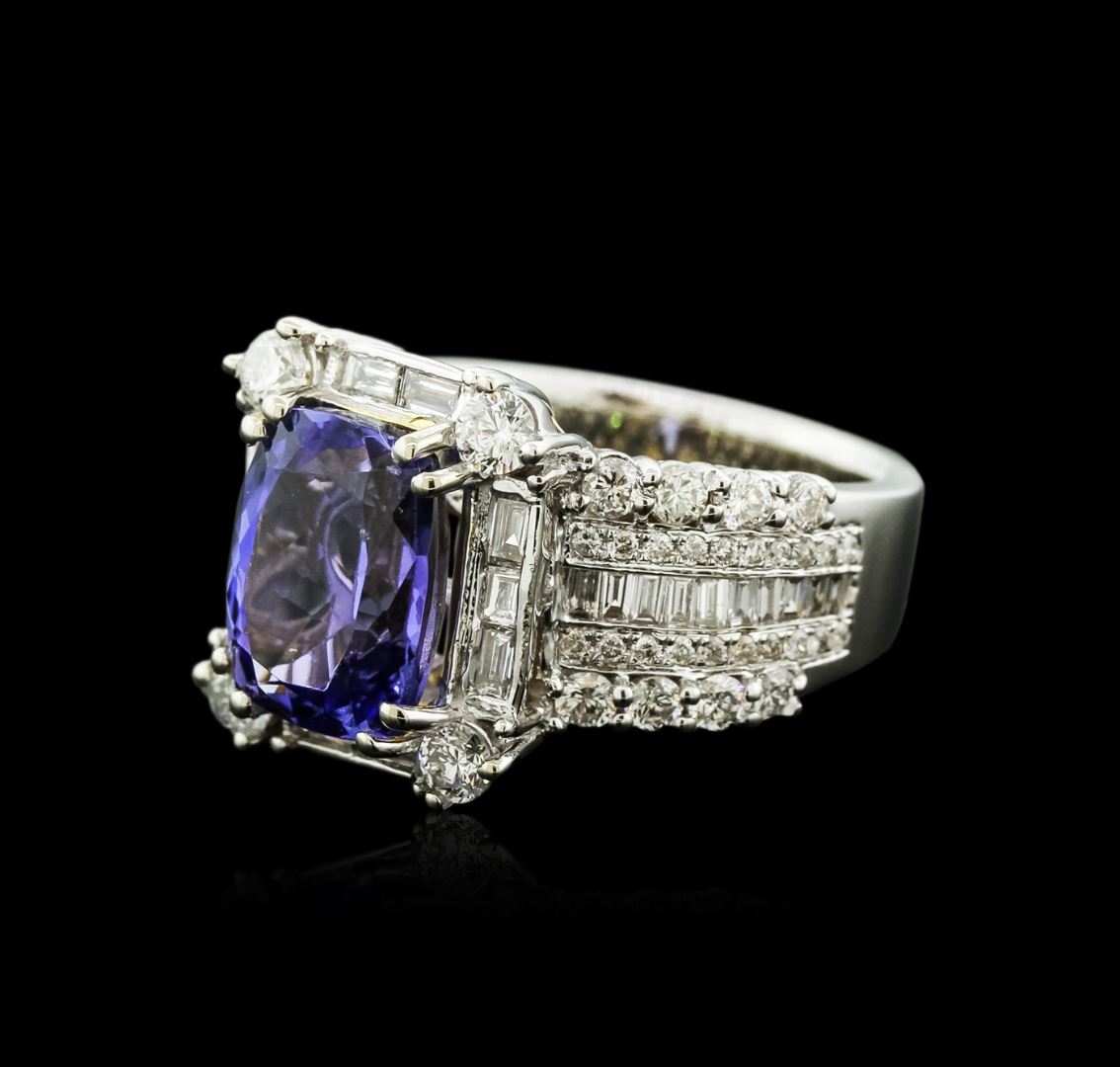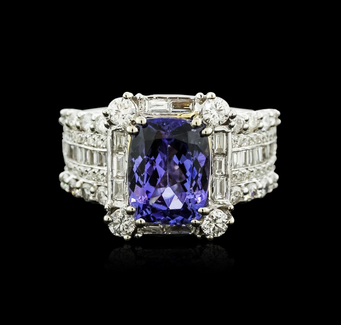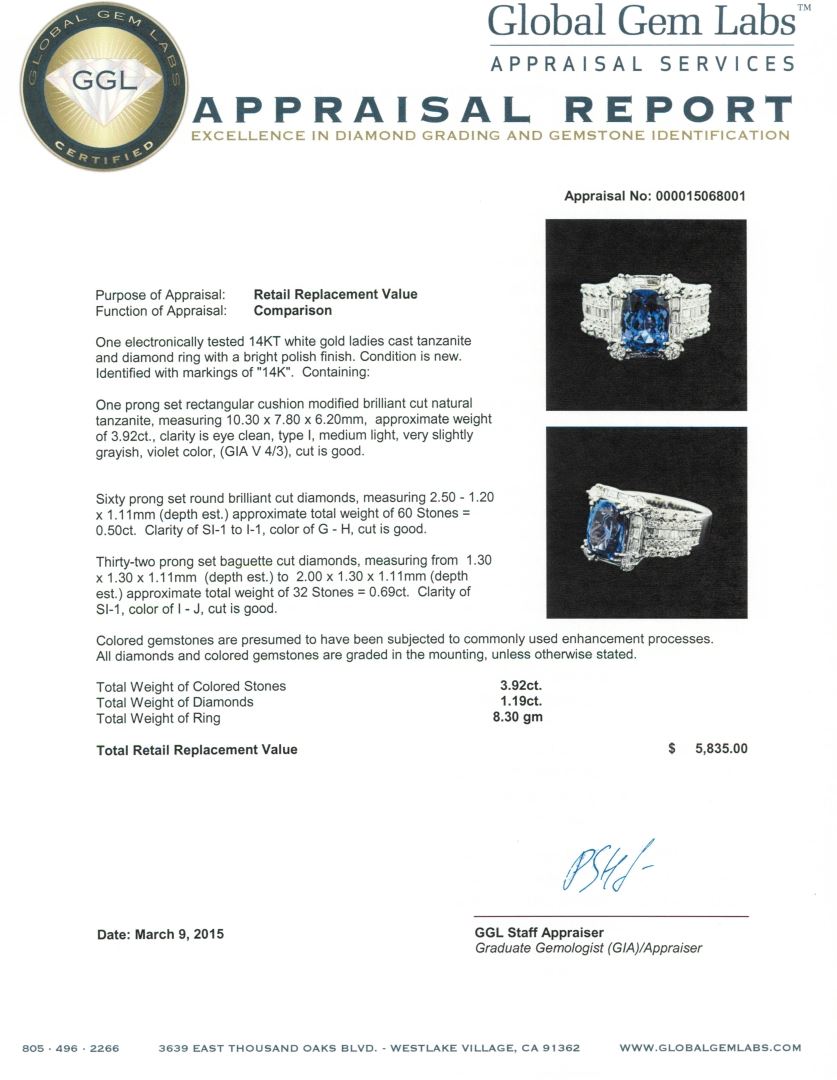 One electronically tested 14KT white gold ladies cast tanzanite and diamond ring with a bright polish finish. Identified with markings of "14K". Condition is new. Containing: One prong set rectangular cushion modified brilliant cut natural tanzanite, measuring 10.30 x 7.80 x 6.20mm, approximate weight of 3.92ct., clarity is eye clean, type I, medium light, very slightly grayish, violet color, (GIA V 4/3), cut is good. Sixty prong set round brilliant cut diamonds, measuring 2.50 - 1.20 x 1.11mm (depth est.) approximate total weight of 60 Stones = 0.50ct. Clarity: SI-1 to I-1. Color: G - H, Cut is Good. Thirty-Two prong set baguette cut diamonds, measuring from 1.30 x 1.30 x 1.11mm (depth est.) to 2.00 x 1.30 x 1.11mm (depth est.) approximate total weight of 32 Stones = 0.69ct. Clarity: SI-1. Color: I - J, Cut is Good. Colored gemstones are presumed to have been subjected to commonly used enhancement processes. All diamonds and colored gemstones are graded in the mounting, unless otherwise stated. Total Weight of Colored Stones 3.92ct. Total Weight of Diamonds 1.19ct. Total Weight of Ring 8.30 grams. GGL Appraised at $5,835.00.