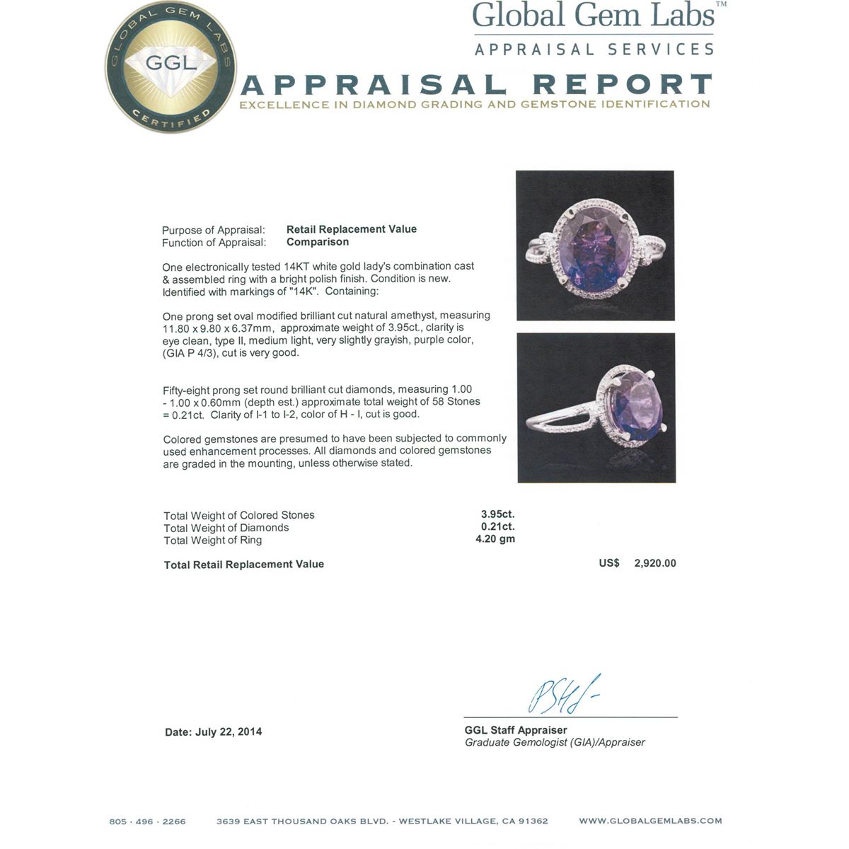One electronically tested 14KT white gold ladies combination cast & assembled ring with a bright polish finish. Condition is new. Identified with markings of "14K". Containing: One prong set oval modified brilliant cut natural amethyst, measuring 11.80 x 9.80 x 6.37mm, approximate weight of 3.95ct., clarity is eye clean, type II, medium light, very slightly grayish, purple color, (GIA P 4/3), cut is very good. Fifty-Eight prong set round brilliant cut diamonds, measuring 1.00 - 1.00 x 0.60mm (depth est.) approximate total weight of 58 Stones = 0.21ct. Clarity: I-1 to I-2. Color: H - I, Cut is Good. Colored gemstones are presumed to have been subjected to commonly used enhancement processes. All diamonds and colored gemstones are graded in the mounting, unless otherwise stated. Total Weight of Colored Stones 3.95ct. Total Weight of Diamonds 0.21ct. Total Weight of Ring 4.20 grams. GGL Appraised at $2,920.00.