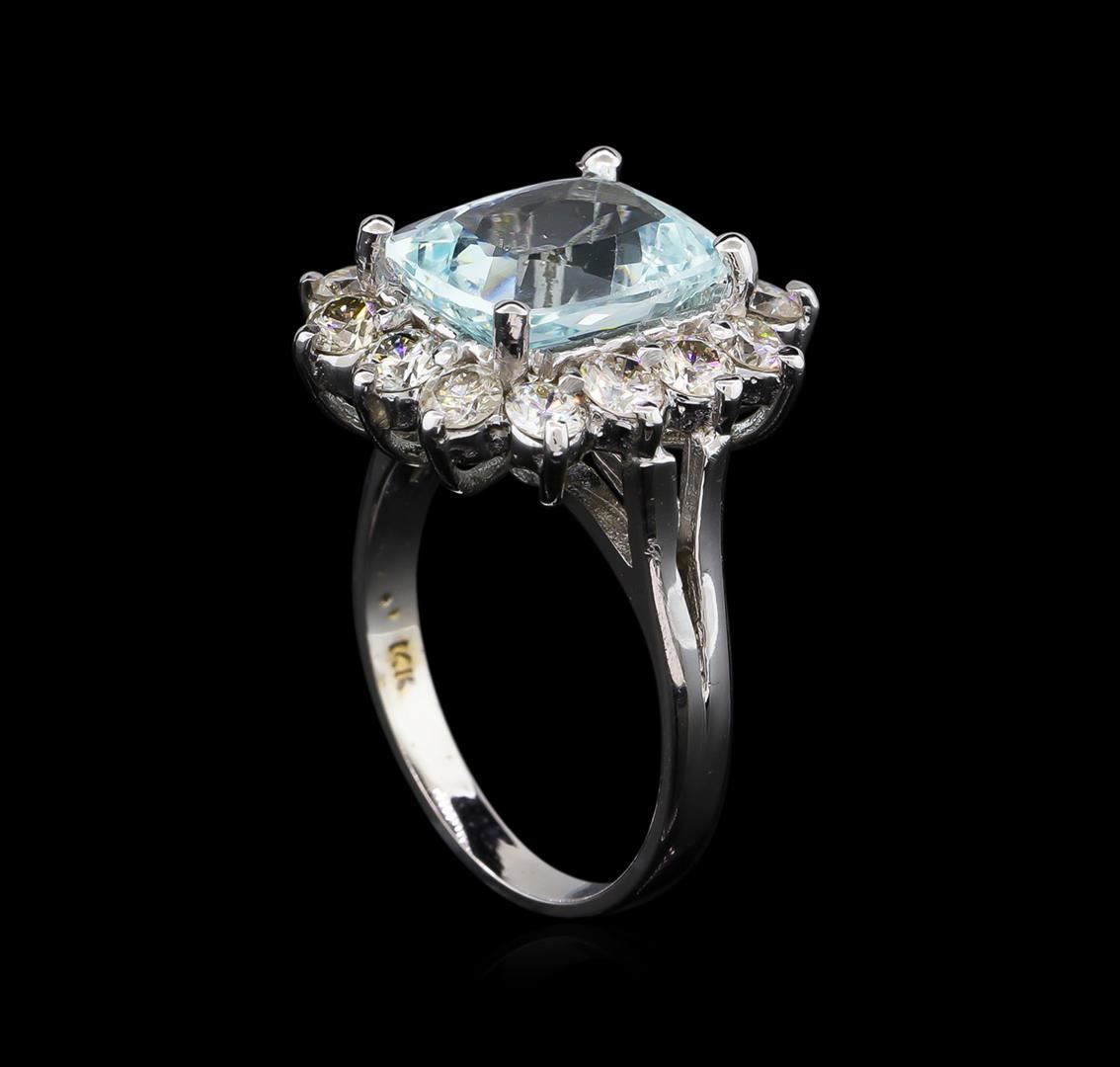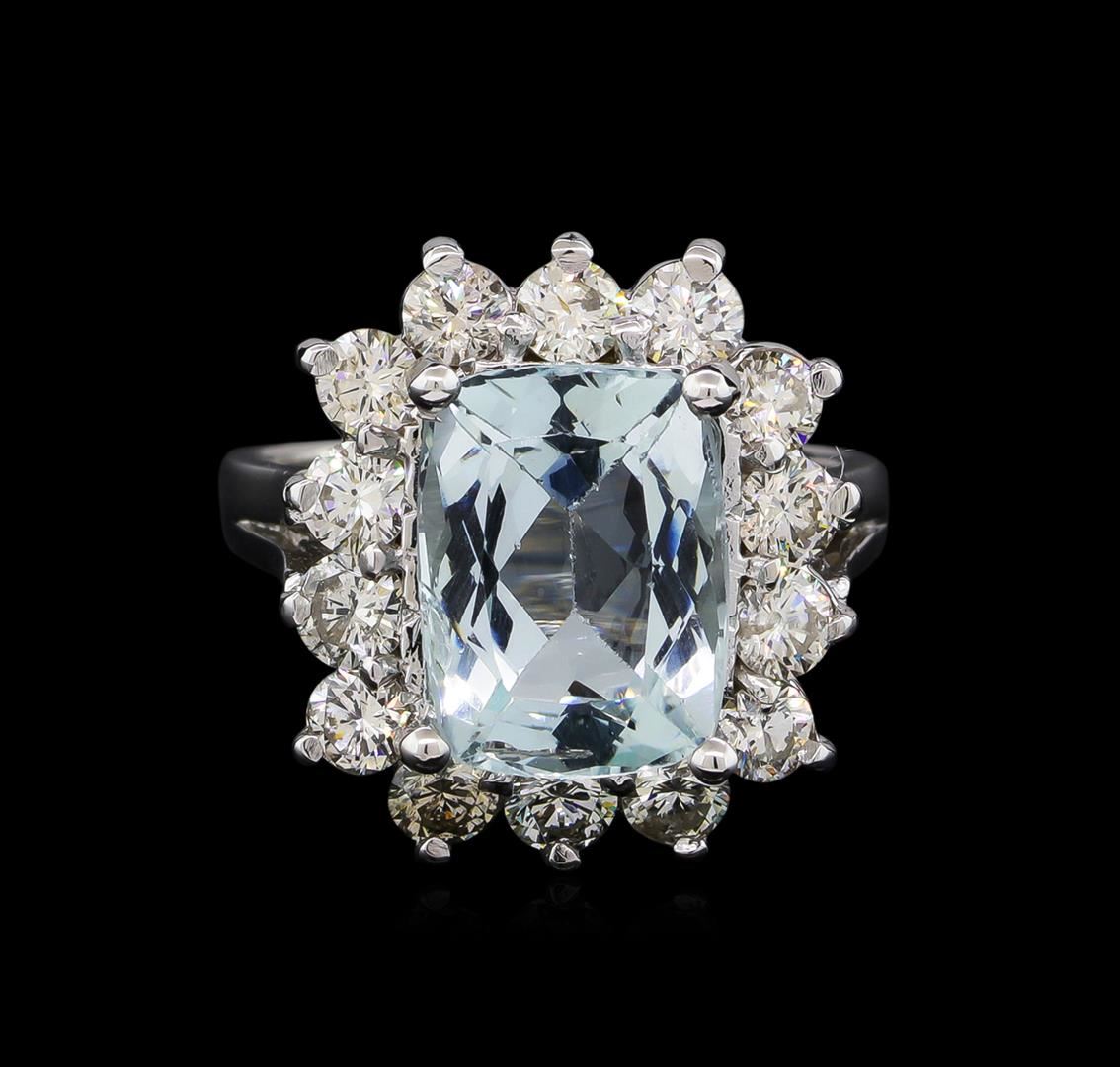 One electronically tested 14KT white gold ladies cast aquamarine and diamond ring with a bright polish finish. Condition is new, good workmanship. The featured aquamarine is set within a diamond bezel, supported by split shoulders and completed by a two and one-half millimeter wide band. Identified with markings of "14K". Containing: One prong set rectangular cushion mixed cut natural aquamarine, measuring 11.70 x 8.60 x 5.70mm, 8%. bulge factor, approximate weight of 3.96ct., clarity is eye clean, type I, medium light, very slightly grayish, very slightly greenish blue color, (GIA vslgB 4/3), cut is good. Transmitting light with no distortion, transparent. Refractive index testing results of 1.56 to 1.57. This is a conclusive result for Aquamarine (Beryl). Graded in the setting. Fourteen prong set round brilliant cut diamonds, measuring 3.30 - 3.10 x 1.92mm (depth est.) approximate. Total Weight of 14 Stones = 1.77ct. Graded in the setting. Clarity: SI-1 to I-1. Color: H - J. Total Weight of Colored Stones 3.96ct. Total Weight of Diamonds 1.77ct. Total Weight of Ring 7.10 grams. AIG Appraised at $7,615.00.