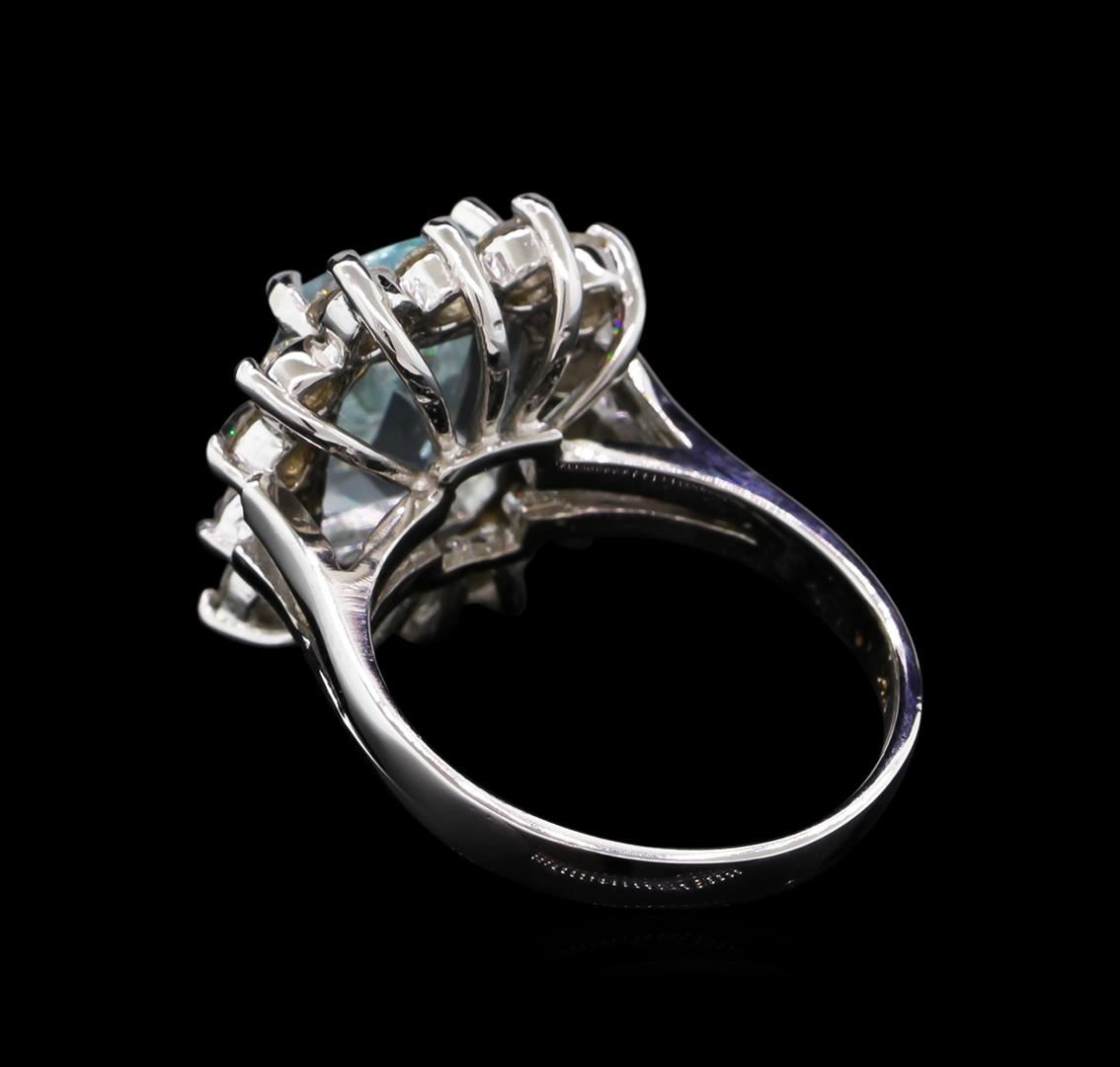 One electronically tested 14KT white gold ladies cast aquamarine and diamond ring with a bright polish finish. Condition is new, good workmanship. The featured aquamarine is set within a diamond bezel, supported by split shoulders and completed by a two and one-half millimeter wide band. Identified with markings of "14K". Containing: One prong set rectangular cushion mixed cut natural aquamarine, measuring 11.70 x 8.60 x 5.70mm, 8%. bulge factor, approximate weight of 3.96ct., clarity is eye clean, type I, medium light, very slightly grayish, very slightly greenish blue color, (GIA vslgB 4/3), cut is good. Transmitting light with no distortion, transparent. Refractive index testing results of 1.56 to 1.57. This is a conclusive result for Aquamarine (Beryl). Graded in the setting. Fourteen prong set round brilliant cut diamonds, measuring 3.30 - 3.10 x 1.92mm (depth est.) approximate. Total Weight of 14 Stones = 1.77ct. Graded in the setting. Clarity: SI-1 to I-1. Color: H - J. Total Weight of Colored Stones 3.96ct. Total Weight of Diamonds 1.77ct. Total Weight of Ring 7.10 grams. AIG Appraised at $7,615.00.