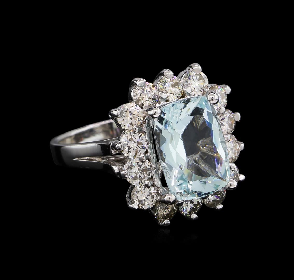 One electronically tested 14KT white gold ladies cast aquamarine and diamond ring with a bright polish finish. Condition is new, good workmanship. The featured aquamarine is set within a diamond bezel, supported by split shoulders and completed by a two and one-half millimeter wide band. Identified with markings of "14K". Containing: One prong set rectangular cushion mixed cut natural aquamarine, measuring 11.70 x 8.60 x 5.70mm, 8%. bulge factor, approximate weight of 3.96ct., clarity is eye clean, type I, medium light, very slightly grayish, very slightly greenish blue color, (GIA vslgB 4/3), cut is good. Transmitting light with no distortion, transparent. Refractive index testing results of 1.56 to 1.57. This is a conclusive result for Aquamarine (Beryl). Graded in the setting. Fourteen prong set round brilliant cut diamonds, measuring 3.30 - 3.10 x 1.92mm (depth est.) approximate. Total Weight of 14 Stones = 1.77ct. Graded in the setting. Clarity: SI-1 to I-1. Color: H - J. Total Weight of Colored Stones 3.96ct. Total Weight of Diamonds 1.77ct. Total Weight of Ring 7.10 grams. AIG Appraised at $7,615.00.