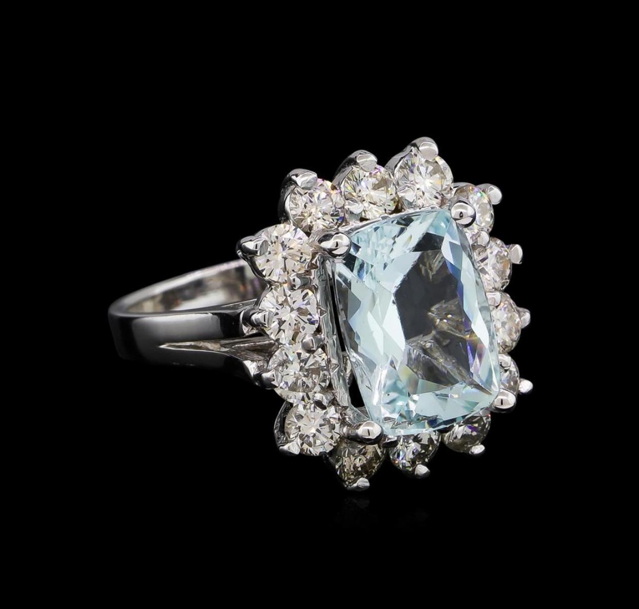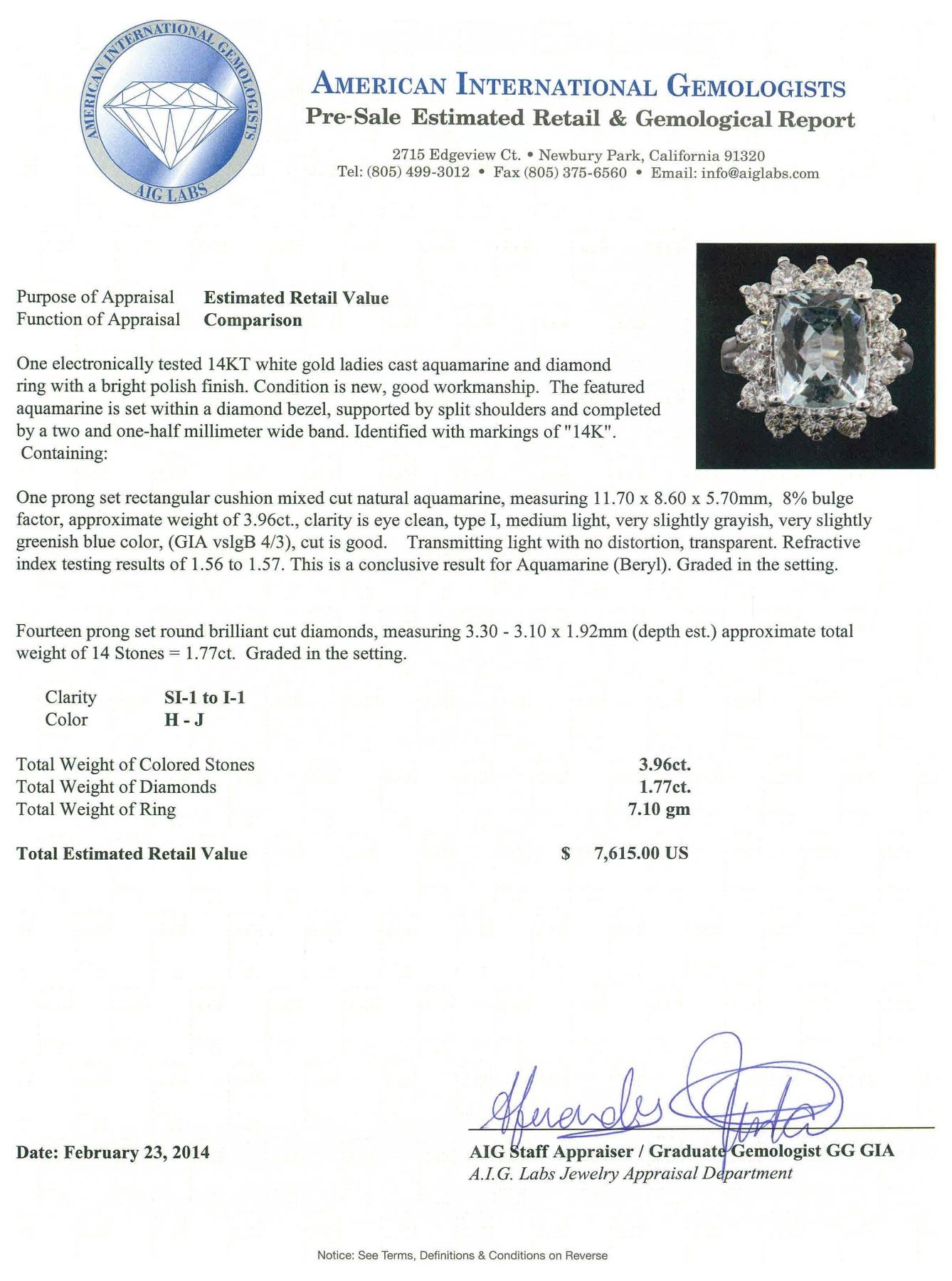 One electronically tested 14KT white gold ladies cast aquamarine and diamond ring with a bright polish finish. Condition is new, good workmanship. The featured aquamarine is set within a diamond bezel, supported by split shoulders and completed by a two and one-half millimeter wide band. Identified with markings of "14K". Containing: One prong set rectangular cushion mixed cut natural aquamarine, measuring 11.70 x 8.60 x 5.70mm, 8%. bulge factor, approximate weight of 3.96ct., clarity is eye clean, type I, medium light, very slightly grayish, very slightly greenish blue color, (GIA vslgB 4/3), cut is good. Transmitting light with no distortion, transparent. Refractive index testing results of 1.56 to 1.57. This is a conclusive result for Aquamarine (Beryl). Graded in the setting. Fourteen prong set round brilliant cut diamonds, measuring 3.30 - 3.10 x 1.92mm (depth est.) approximate. Total Weight of 14 Stones = 1.77ct. Graded in the setting. Clarity: SI-1 to I-1. Color: H - J. Total Weight of Colored Stones 3.96ct. Total Weight of Diamonds 1.77ct. Total Weight of Ring 7.10 grams. AIG Appraised.