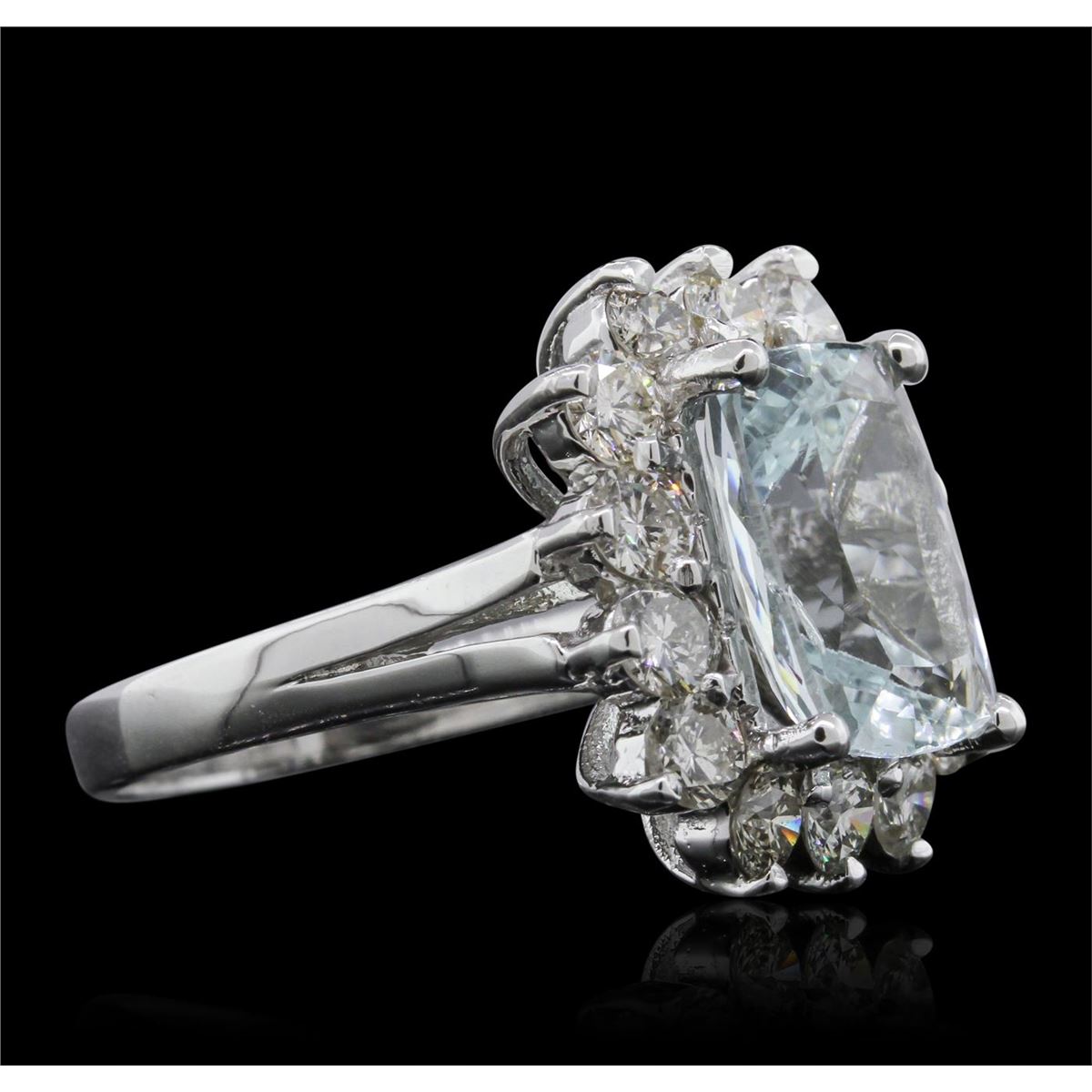 One electronically tested 14KT white gold ladies cast aquamarine and diamond ring with a bright polish finish. Condition is new, good workmanship. The featured aquamarine is set within a diamond bezel, supported by split shoulders and completed by a two and one-half millimeter wide band. Identified with markings of "14K". Containing: One prong set rectangular cushion mixed cut natural aquamarine, measuring 11.70 x 8.60 x 5.70mm, 8%. bulge factor, approximate weight of 3.96ct., clarity is eye clean, type I, medium light, very slightly grayish, very slightly greenish blue color, (GIA vslgB 4/3), cut is good. Transmitting light with no distortion, transparent. Refractive index testing results of 1.56 to 1.57. This is a conclusive result for Aquamarine (Beryl). Graded in the setting. Fourteen prong set round brilliant cut diamonds, measuring 3.30 - 3.10 x 1.92mm (depth est.) approximate. Total Weight of 14 Stones = 1.77ct. Graded in the setting. Clarity: SI-1 to I-1. Color: H - J. Total Weight of Colored Stones 3.96ct. Total Weight of Diamonds 1.77ct. Total Weight of Ring 7.10 grams. AIG Appraised at $7,615.00.