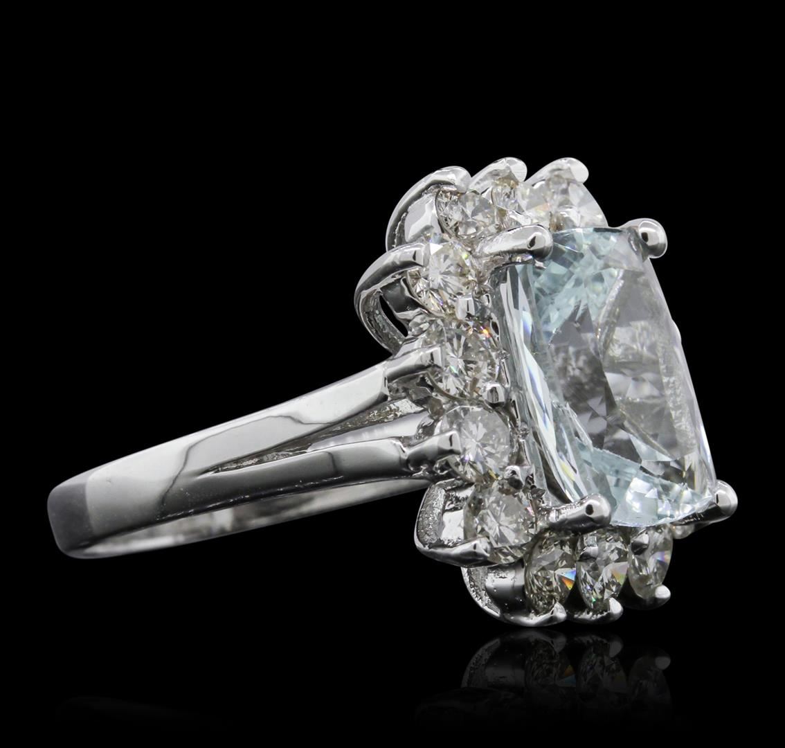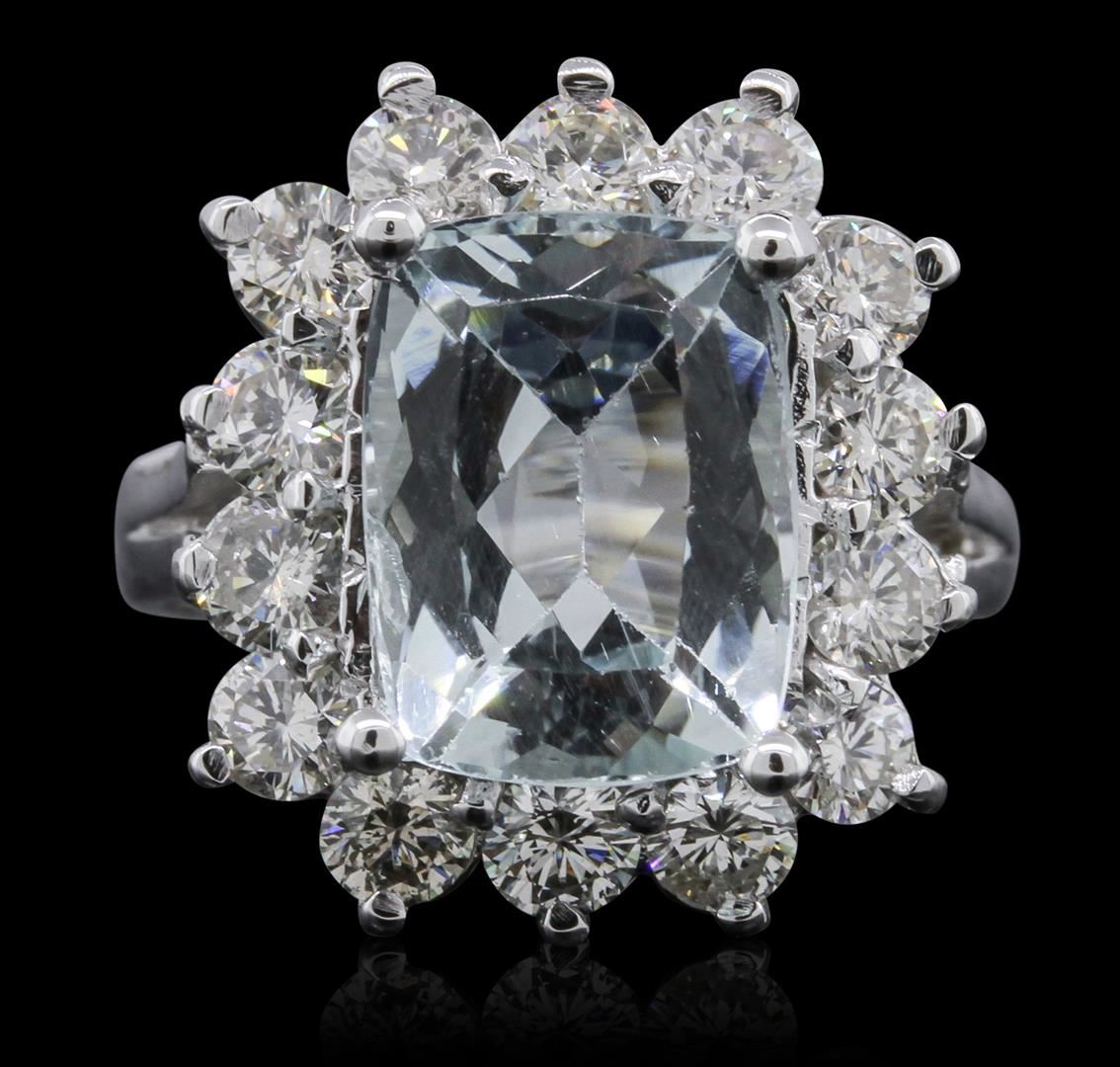 One electronically tested 14KT white gold ladies cast aquamarine and diamond ring with a bright polish finish. Condition is new, good workmanship. The featured aquamarine is set within a diamond bezel, supported by split shoulders and completed by a two and one-half millimeter wide band. Identified with markings of "14K". Containing: One prong set rectangular cushion mixed cut natural aquamarine, measuring 11.70 x 8.60 x 5.70mm, 8%. bulge factor, approximate weight of 3.96ct., clarity is eye clean, type I, medium light, very slightly grayish, very slightly greenish blue color, (GIA vslgB 4/3), cut is good. Transmitting light with no distortion, transparent. Refractive index testing results of 1.56 to 1.57. This is a conclusive result for Aquamarine (Beryl). Graded in the setting. Fourteen prong set round brilliant cut diamonds, measuring 3.30 - 3.10 x 1.92mm (depth est.) approximate. Total Weight of 14 Stones = 1.77ct. Graded in the setting. Clarity: SI-1 to I-1. Color: H - J. Total Weight of Colored Stones 3.96ct. Total Weight of Diamonds 1.77ct. Total Weight of Ring 7.10 grams. AIG Appraised at $7,615.00.