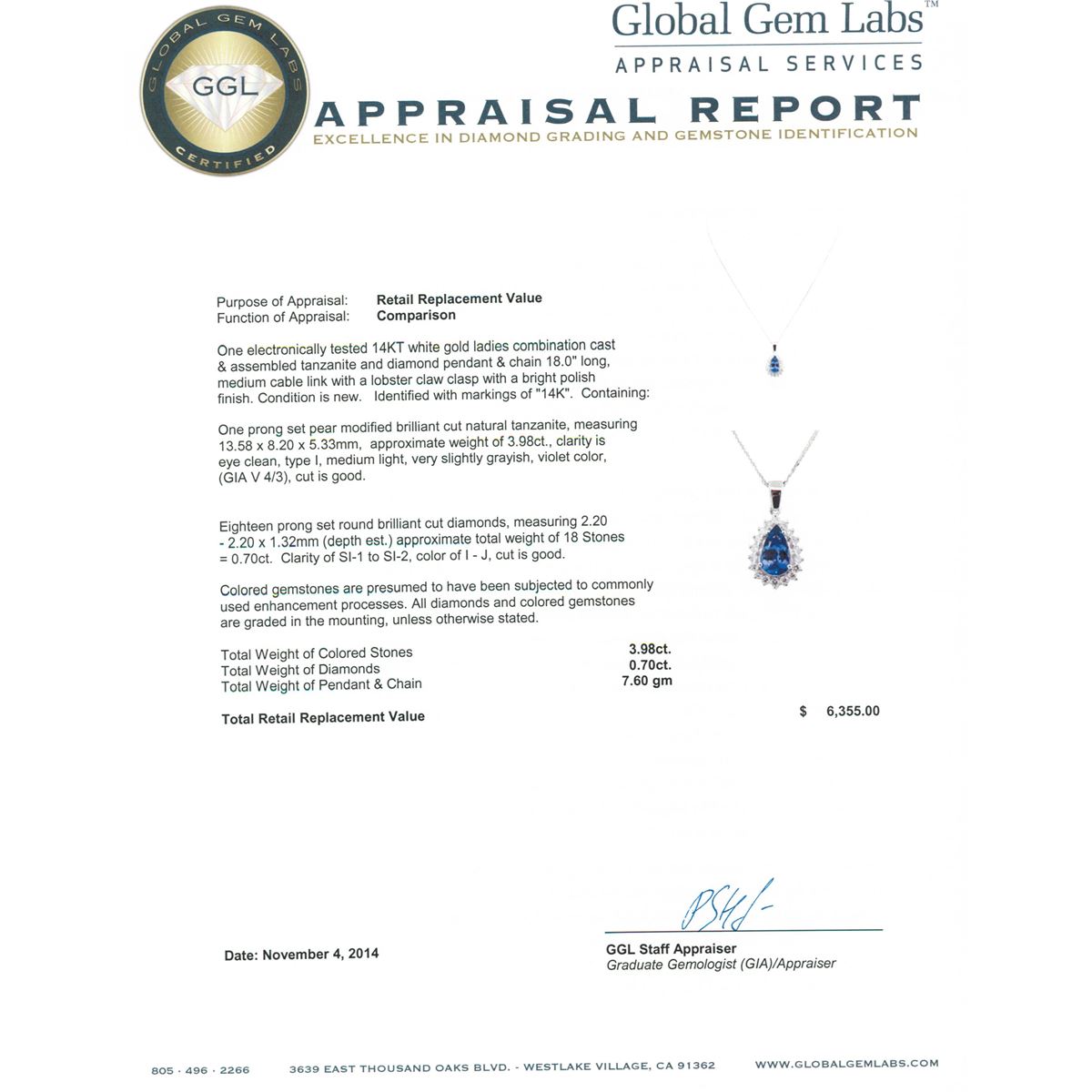 One electronically tested 14KT white gold ladies combination cast & assembled tanzanite and diamond pendant & chain 18.0" long, medium cable link with a lobster claw clasp with a bright polish finish. Identified with markings of "14K". Condition is new. Containing: One prong set pear modified brilliant cut natural tanzanite, measuring 13.58 x 8.20 x 5.33mm, approximate weight of 3.98ct., clarity is eye clean, type I, medium light, very slightly grayish, violet color, (GIA V 4/3), cut is good. Eighteen prong set round brilliant cut diamonds, measuring 2.20 - 2.20 x 1.32mm (depth est.) approximate total weight of 18 Stones = 0.70ct. Clarity: SI-1 to SI-2. Color: I - J, Cut is Good. Colored gemstones are presumed to have been subjected to commonly used enhancement processes. All diamonds and colored gemstones are graded in the mounting, unless otherwise stated. Total Weight of Colored Stones 3.98ct. Total Weight of Diamonds 0.70ct. Total Weight of Pendant & Chain 7.60 grams. GGL Appraised at $6,355.00.