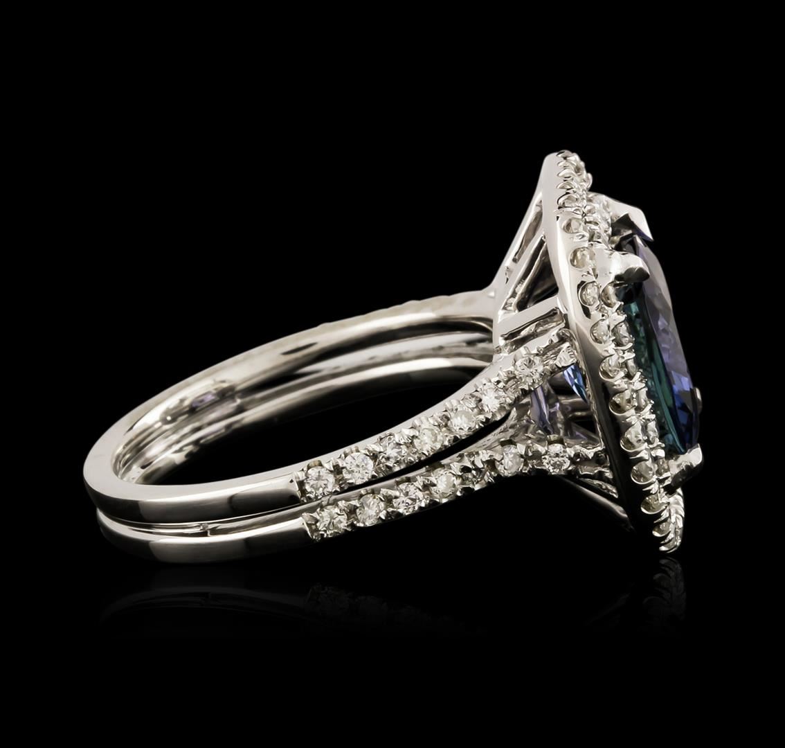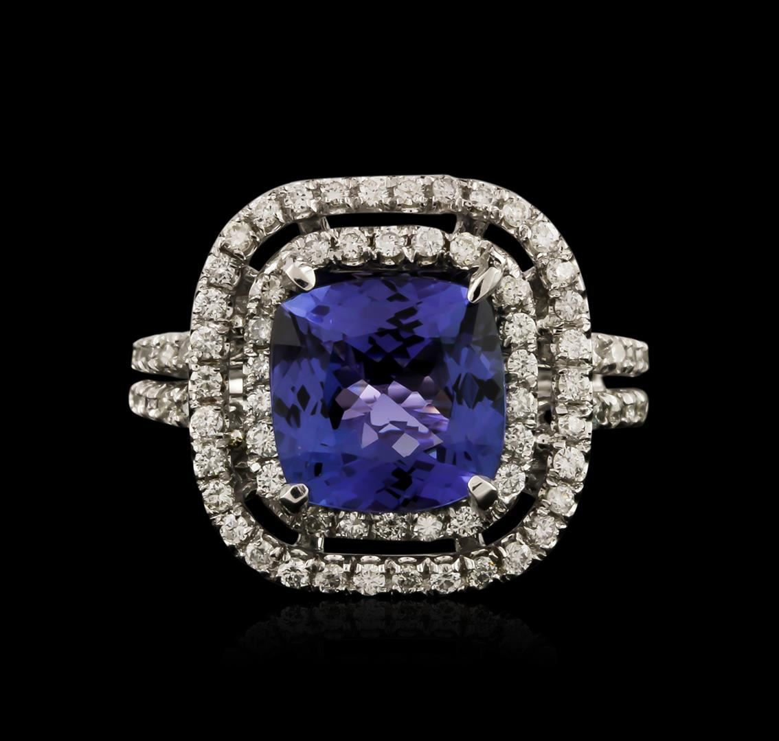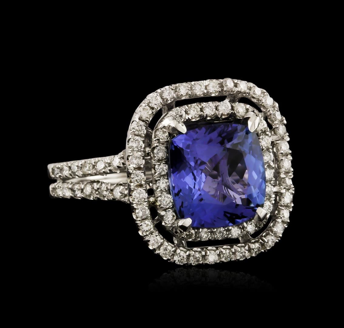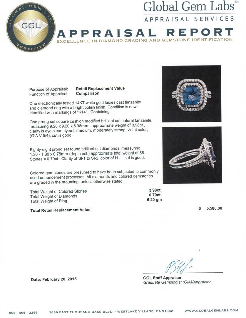 One electronically tested 14KT white gold ladies cast tanzanite and diamond ring with a bright polish finish. Identified with markings of "K14". Condition is new. Containing: One prong set square cushion modified brilliant cut natural tanzanite, measuring 9.20 x 9.20 x 5.98mm, approximate weight of 3.98ct., clarity is eye clean, type I, medium, moderately strong, violet color, (GIA V 5/4), cut is good. Eighty-Eight prong set round brilliant cut diamonds, measuring 1.30 - 1.30 x 0.78mm (depth est.) approximate total weight of 88 Stones = 0.70ct. Clarity: SI-1 to SI-2. Color: H - I, Cut is Good. Colored gemstones are presumed to have been subjected to commonly used enhancement processes. All diamonds and colored gemstones are graded in the mounting, unless otherwise stated. Total Weight of Colored Stones 3.98ct. Total Weight of Diamonds 0.70ct. Total Weight of Ring 6.20 grams. GGL Appraised at $5,580.00.