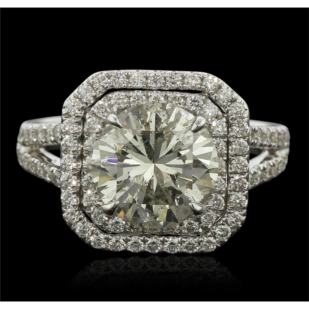 One electronically tested 14KT white gold ladies cast diamond unity ring with a bright polish finish. Condition is new, good workmanship. The featured diamond is set within a two tiered diamond bezel supported by diamond set split shoulders, completed by a two and one-half millimeter wide band. Trademark is DAYANii. Identified with markings of "14K". Containing: One prong set round brilliant cut diamond, measuring 9.30 - 9.25 x 5.70mm (depth est.) approximate weight of 3.09ct with a medium blue fluorescence. Faint secondary color throughout. Diamond Grading Report attached. Graded in the setting. Clarity: I-1. Depth: 61.4%. Table 64.7%. Eighty-Eight prong set round brilliant cut diamonds, measuring 1.40 - 1.30 x 0.81mm (depth est.) approximate. Total Weight of 88 Stones = 0.90ct. Graded in the setting. Clarity: VS-1 to SI-1. Color: G - I. Total Weight of Diamonds 3.99ct. Total Weight of Ring 5.85 grams. AIG Appraised at $33,230.00.