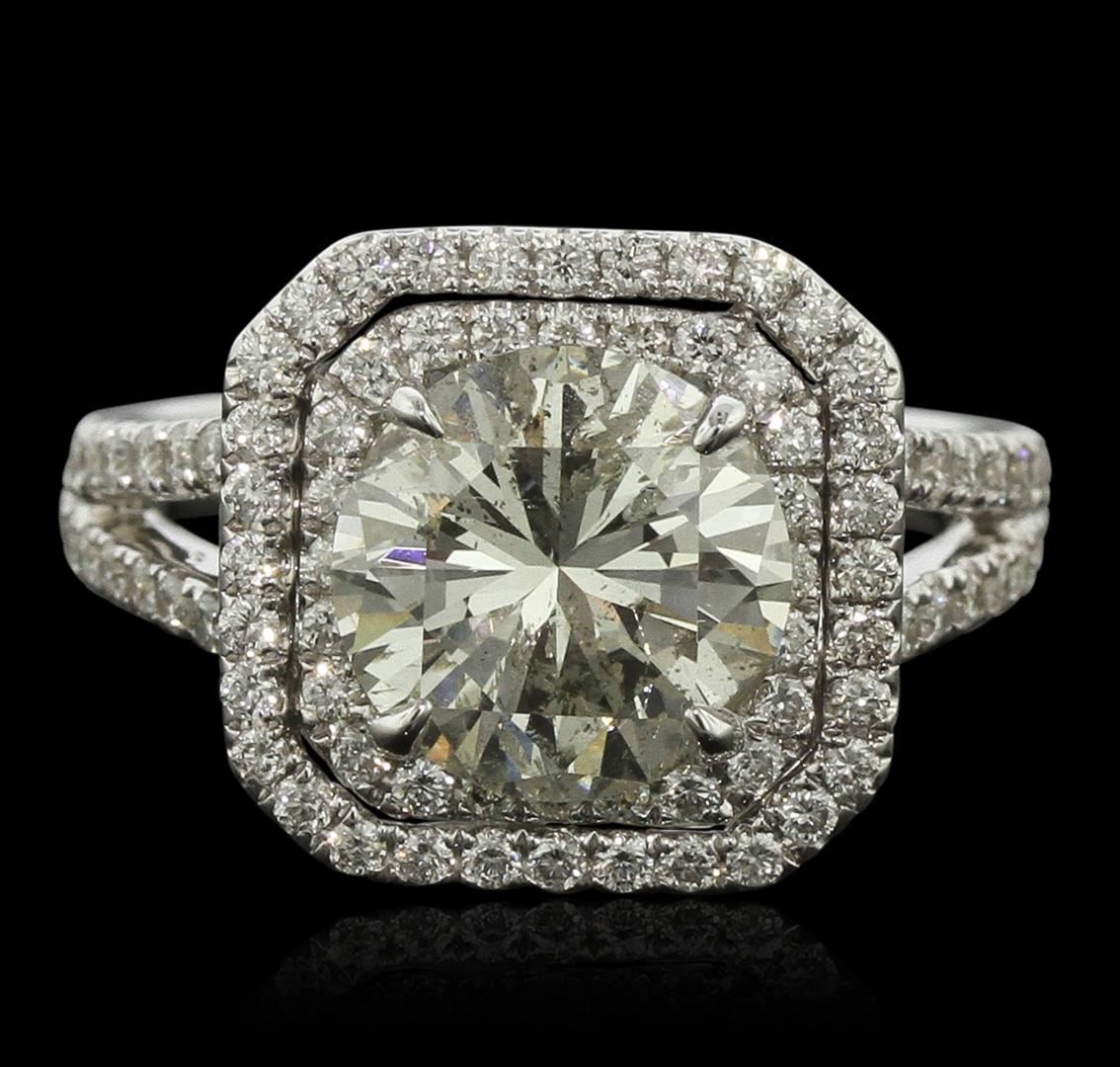 One electronically tested 14KT white gold ladies cast diamond unity ring with a bright polish finish. Condition is new, good workmanship. The featured diamond is set within a two tiered diamond bezel supported by diamond set split shoulders, completed by a two and one-half millimeter wide band. Trademark is DAYANii. Identified with markings of "14K". Containing: One prong set round brilliant cut diamond, measuring 9.30 - 9.25 x 5.70mm (depth est.) approximate weight of 3.09ct with a medium blue fluorescence. Faint secondary color throughout. Diamond Grading Report attached. Graded in the setting. Clarity: I-1. Depth: 61.4%. Table 64.7%. Eighty-Eight prong set round brilliant cut diamonds, measuring 1.40 - 1.30 x 0.81mm (depth est.) approximate. Total Weight of 88 Stones = 0.90ct. Graded in the setting. Clarity: VS-1 to SI-1. Color: G - I. Total Weight of Diamonds 3.99ct. Total Weight of Ring 5.85 grams. AIG Appraised at $33,230.00.