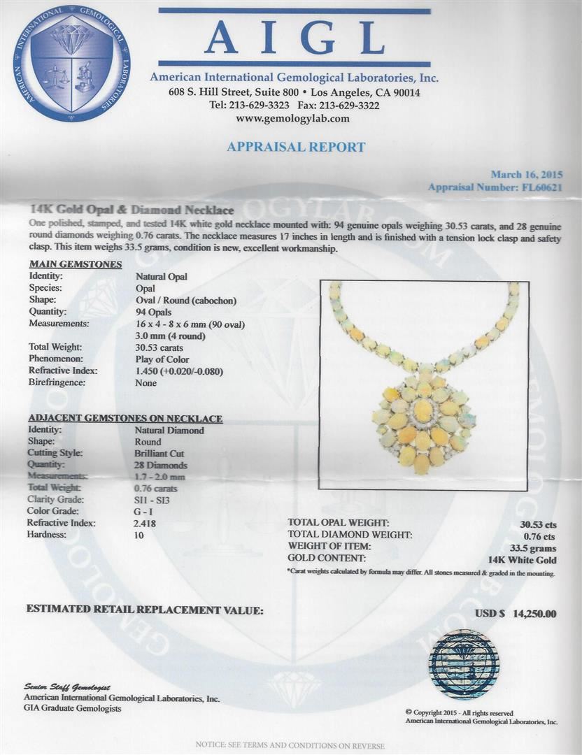One polished, stamped, and tested 14K white gold necklace mounted with: 94 genuine opals weighing 30.53 carats, and 28 genuine round diamonds weighing 0.76 carats. The necklace measures 17 inches in length and is finished with a tension lock clasp and safety clasp. This item weighs 33.5 grams, condition is new, excellent workmanship. MAIN GEMSTONES: Identity: Natural Opal. Species: Opal. Shape: Oval / Round (cabochon). Quantity: 94 Opals. Measurements: 16 x 4 - 8 x 6 mm (90 oval) 3.0 mm (4 round). Total Weight: 30.53 carats. Phenomenon: Play of Color. Refractive Index: 1.450 (+0.020/-0.080). Birefringence: None. ADJACENT GEMSTONES ON NECKLACE: Identity: Natural Diamond. Shape: Round. Cutting Style: Brilliant Cut. Quantity: 28 Diamonds. Measurements: 1.7 - 2.0 mm. Total Weight: 0.76 carats. Clarity Grade: SI1 - SI3. Color Grade: G - I. Refractive Index: 2.418. Hardness: 10. Total Opal Weight: 30.53 cts. Total Diamond Weight: 0.76 cts. Weight of Item: 33.5 grams. Gold Content: 14K White Gold. AIGL Appraised at $14,250.00.