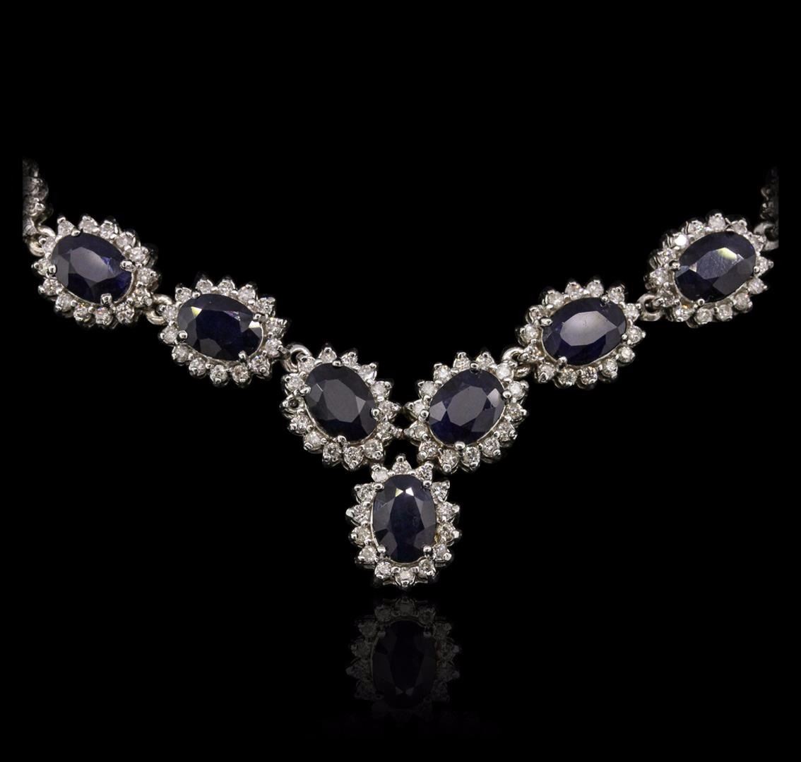 One electronically tested 14KT white gold ladies cast & assembled sapphire and diamond necklace with a bright polish finish. Condition is new, good workmanship. Sixteen inch length chevron style necklace features a flexible sapphire and diamond floret ribbon, terminating in a concealed clasp with safety. Identified with markings of "14K". Containing: Thirty-seven prong set oval mixed cut natural blue sapphires, measuring 7.00 x 4.90 x 2.70mm, 8%. bulge factor, approximate. Total Weight of 30.71ct., clarity is heavily included, type II, dark, very slightly grayish, violetish blue color, (GIA vB 7/3), cut is good. Transmitting light somewhat diffusely, transparent to translucent. Naturally occurring internal & external characteristics are present. Measurements & the color grade are an average for the group. Indications of multiple laboratory enhancements, including high temperature diffusion treatment. Graded in the setting. Five Hundred Eighteen prong set round brilliant cut diamonds, measuring 1.40 - 1.30 x 0.81mm (depth est.) approximate. Total Weight of 518 Stones = 4.76ct. Graded in the setting. Clarity: I-1 to I-2. Color: H - J. Total Weight of Colored Stones 30.71ct. Total Weight of Diamonds 4.76ct. Total Weight of Necklace 47.74 grams. AIG Appraised at $26,625.00.