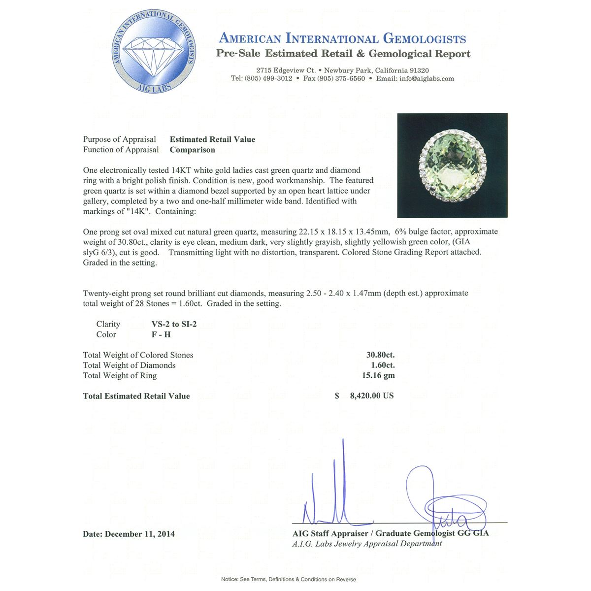 One electronically tested 14KT white gold ladies cast green quartz and diamond ring with a bright polish finish. The featured green quartz is set within a diamond bezel supported by an open heart lattice under gallery, completed by a two and one-half millimeter wide band. Identified with markings of "14K". Condition is new, good workmanship. Containing: One prong set oval mixed cut natural green quartz, measuring 22.15 x 18.15 x 13.45mm, 6% bulge factor, approximate weight of 30.80ct., clarity is eye clean, medium dark, very slightly grayish, slightly yellowish green color, (GIA slyG 6/3), cut is good. Transmitting light with no distortion, transparent. Colored Stone Grading Report attached. Graded in the setting. Twenty-Eight prong set round brilliant cut diamonds, measuring 2.50 - 2.40 x 1.47mm (depth est.) approximate total weight of 28 Stones = 1.60ct. Graded in the setting. Clarity: VS-2 to SI-2. Color: F - H. Total Weight of Colored Stones 30.80ct. Total Weight of Diamonds 1.60ct. Total Weight of Ring 15.16 grams. AIG Appraised at $8,420.00.