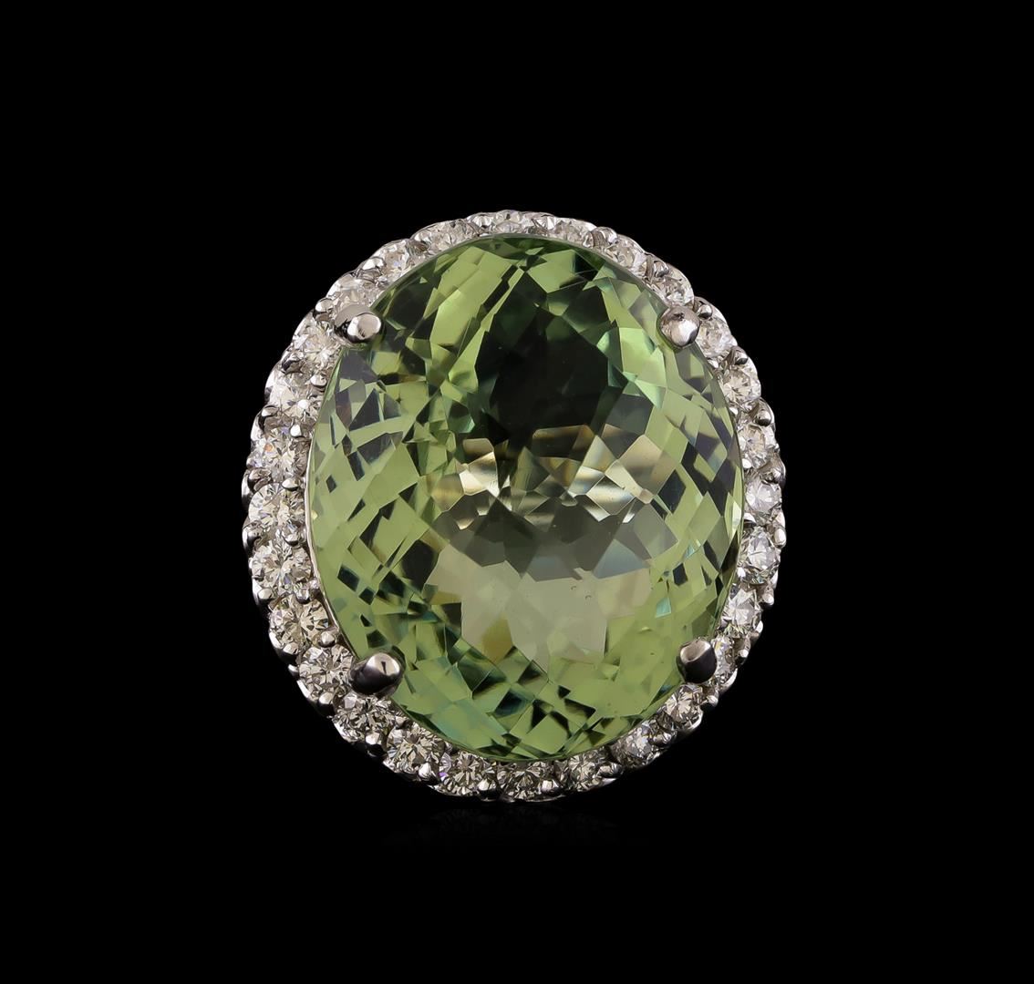 One electronically tested 14KT white gold ladies cast green quartz and diamond ring with a bright polish finish. The featured green quartz is set within a diamond bezel supported by an open heart lattice under gallery, completed by a two and one-half millimeter wide band. Identified with markings of "14K". Condition is new, good workmanship. Containing: One prong set oval mixed cut natural green quartz, measuring 22.15 x 18.15 x 13.45mm, 6% bulge factor, approximate weight of 30.80ct., clarity is eye clean, medium dark, very slightly grayish, slightly yellowish green color, (GIA slyG 6/3), cut is good. Transmitting light with no distortion, transparent. Colored Stone Grading Report attached. Graded in the setting. Twenty-Eight prong set round brilliant cut diamonds, measuring 2.50 - 2.40 x 1.47mm (depth est.) approximate total weight of 28 Stones = 1.60ct. Graded in the setting. Clarity: VS-2 to SI-2. Color: F - H. Total Weight of Colored Stones 30.80ct. Total Weight of Diamonds 1.60ct. Total Weight of Ring 15.16 grams. AIG Appraised at $8,420.00.