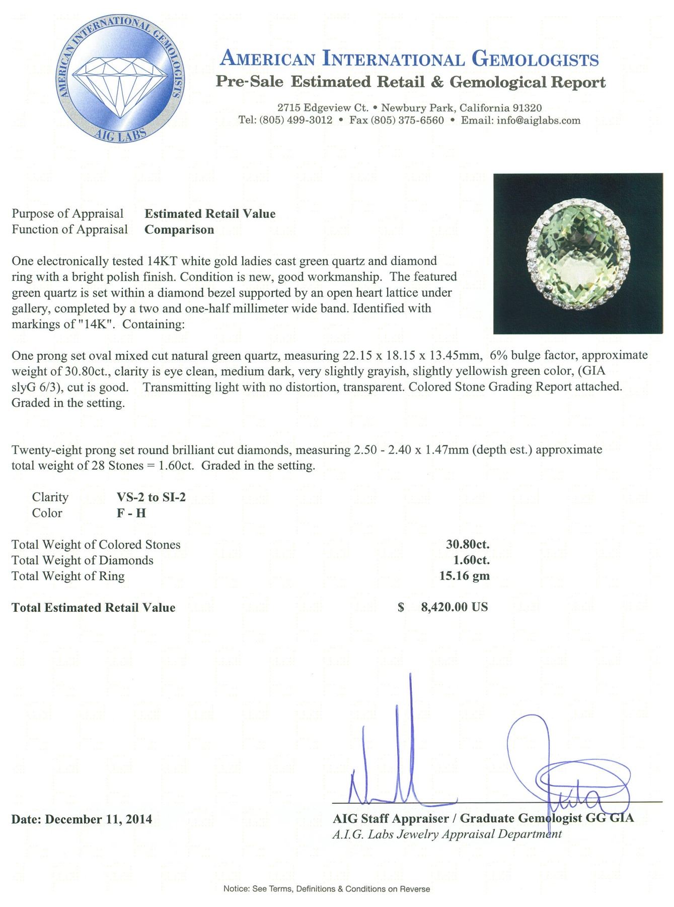 One electronically tested 14KT white gold ladies cast green quartz and diamond ring with a bright polish finish. The featured green quartz is set within a diamond bezel supported by an open heart lattice under gallery, completed by a two and one-half millimeter wide band. Identified with markings of "14K". Condition is new, good workmanship. Containing: One prong set oval mixed cut natural green quartz, measuring 22.15 x 18.15 x 13.45mm, 6% bulge factor, approximate weight of 30.80 ct., clarity is eye clean, medium dark, very slightly grayish, slightly yellowish green color, (GIA slyG 6/3), cut is good. Transmitting light with no distortion, transparent. Colored Stone Grading Report attached. Graded in the setting. Twenty-Eight prong set round brilliant cut diamonds, measuring 2.50 - 2.40 x 1.47mm (depth est.) approximate total weight of 28 Stones = 1.60 ct. Graded in the setting. Clarity: VS-2 to SI-2. Color: F - H. Total Weight of Colored Stones 30.80 ct. Total Weight of Diamonds 1.60 ct. Total Weight of Ring 15.16 grams. AIG Appraised.