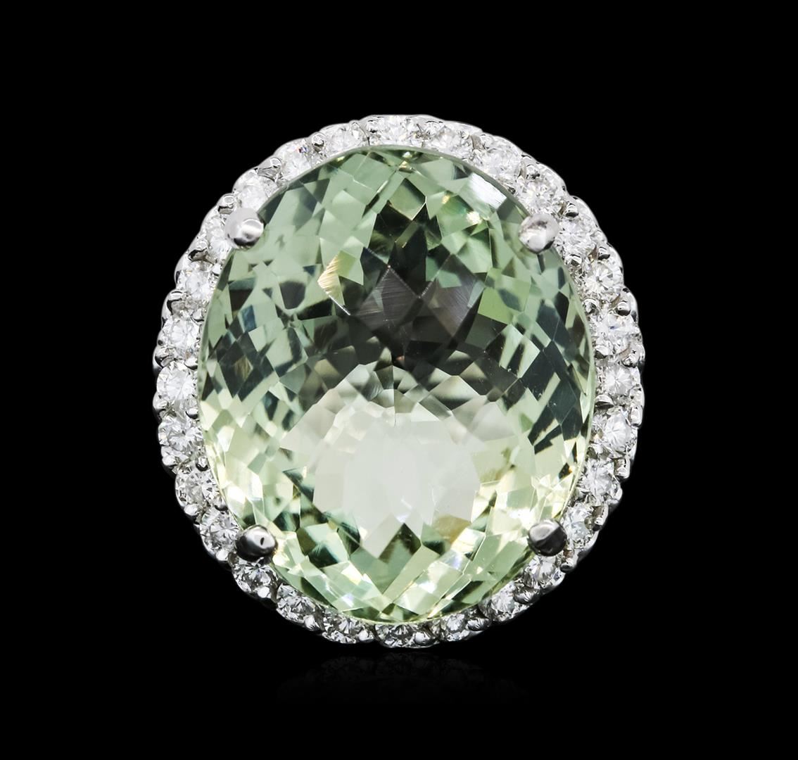 One electronically tested 14KT white gold ladies cast green quartz and diamond ring with a bright polish finish. The featured green quartz is set within a diamond bezel supported by an open heart lattice under gallery, completed by a two and one-half millimeter wide band. Identified with markings of "14K". Condition is new, good workmanship. Containing: One prong set oval mixed cut natural green quartz, measuring 22.15 x 18.15 x 13.45mm, 6% bulge factor, approximate weight of 30.80ct., clarity is eye clean, medium dark, very slightly grayish, slightly yellowish green color, (GIA slyG 6/3), cut is good. Transmitting light with no distortion, transparent. Colored Stone Grading Report attached. Graded in the setting. Twenty-Eight prong set round brilliant cut diamonds, measuring 2.50 - 2.40 x 1.47mm (depth est.) approximate total weight of 28 Stones = 1.60ct. Graded in the setting. Clarity: VS-2 to SI-2. Color: F - H. Total Weight of Colored Stones 30.80ct. Total Weight of Diamonds 1.60ct. Total Weight of Ring 15.16 grams. AIG Appraised at $8,420.00.