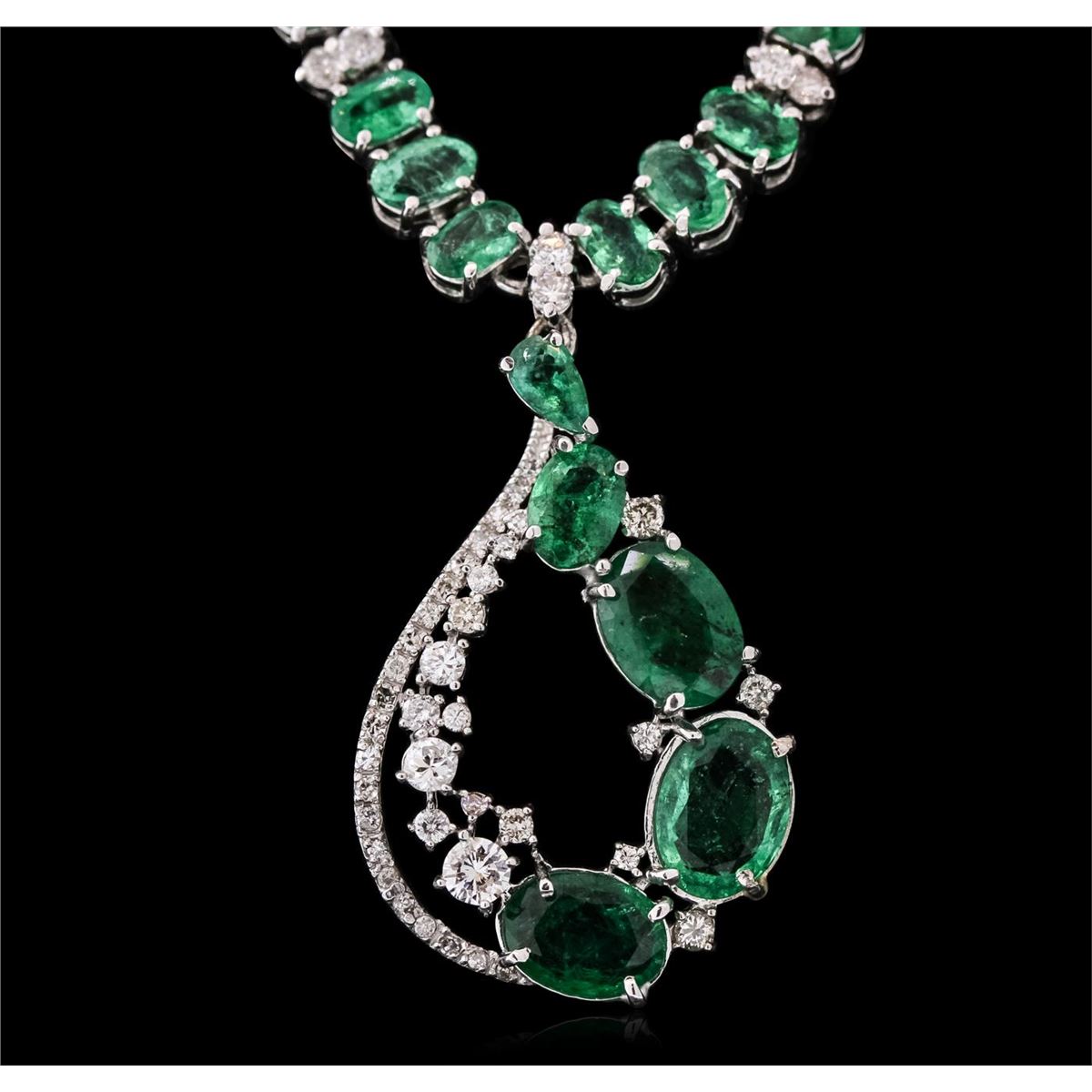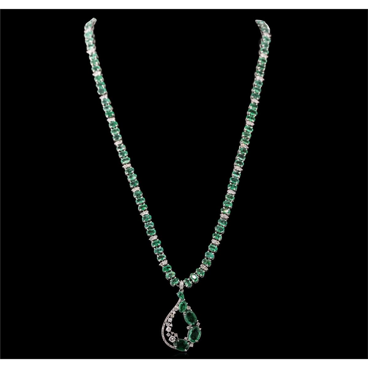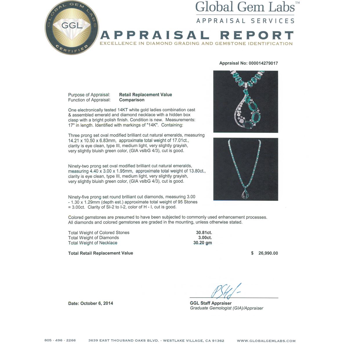 One electronically tested 14KT white gold ladies combination cast & assembled emerald and diamond necklace with a hidden box clasp with a bright polish finish. Measurements: 17" in length. Identified with markings of "14K". Condition is new. Containing: Three prong set oval modified brilliant cut natural emeralds, measuring 14.21 x 10.50 x 6.83mm, approximate total weight of 17.01ct., clarity is eye clean, type III, medium light, very slightly grayish, very slightly bluish green color, (GIA vslbG 4/3), cut is good. Ninety-two prong set oval modified brilliant cut natural emeralds, measuring 4.40 x 3.00 x 1.95mm, approximate total weight of 13.80ct., clarity is eye clean, type III, medium light, very slightly grayish, very slightly bluish green color, (GIA vslbG 4/3), cut is good. Ninety-Five prong set round brilliant cut diamonds, measuring 3.00 - 1.30 x 1.29mm (depth est.) approximate total weight of 95 Stones = 3.00ct. Clarity: SI-2 to I-2. Color: H - I, Cut is Good. Colored gemstones are presumed to have been subjected to commonly used enhancement processes. All diamonds and colored gemstones are graded in the mounting, unless otherwise stated. Total Weight of Colored Stones 30.81ct. Total Weight of Diamonds 3.00ct. Total Weight of Necklace 30.20 grams. GGL Appraised at $26,990.00.