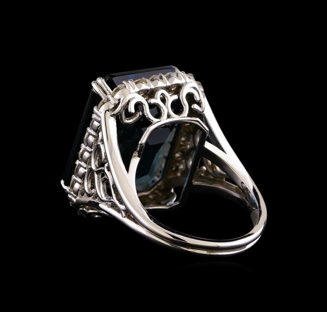 One electronically tested 14KT white gold ladies cast blue topaz and diamond ring with a bright polish finish. The featured blue topaz is set within a diamond bezel supported by tapering lattice design shoulders, completed by a grooved two and one-half millimeter wide band. Identified with markings of "585". Condition is new, good workmanship. Containing: One prong set rectangular step cut natural blue topaz, measuring 20.00 x 15.00 x 9.80mm, approximate weight of 31.13ct., clarity is eye clean, type I, dark, moderately strong, greenish blue color, (GIA gB 7/4), cut is good. Transmitting light with no distortion, transparent. Graded in the setting. A deposit of a thin layer has been applied to the topaz to produce the intense color effect. The process utilizes a very high temperature treatment, diffusion of ions into the topaz, plus in some cases neutron bombardment has been used to create the color center. Diffusion processes causes the added ions to become part of the crystal surface with no distinct boundary. Do not put a gem treated in this manner into an ultrasonic cleaner. Twenty-Four prong set round brilliant cut diamonds, measuring 2.70 - 2.60 x 1.59mm (depth est.) approximate total weight of 24 Stones = 1.73ct. Graded in the setting. Clarity: SI-1 to I-1. Color: G - I. Total Weight of Colored Stones 31.13ct. Total Weight of Diamonds 1.73ct. Total Weight of Ring 13.82 grams. AIG Appraised at $7,055.00.