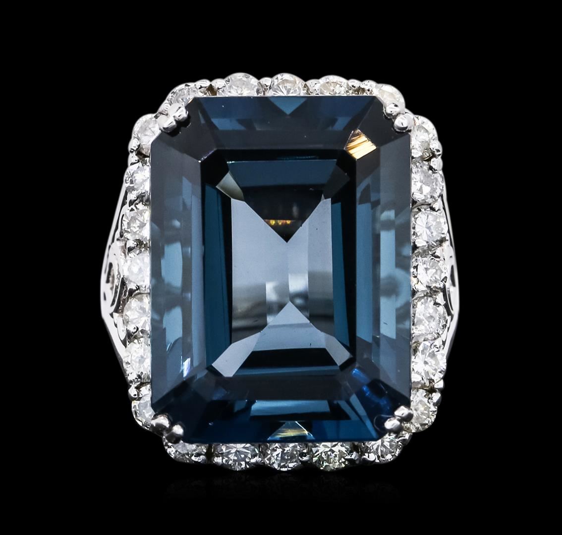 One electronically tested 14KT white gold ladies cast blue topaz and diamond ring with a bright polish finish. The featured blue topaz is set within a diamond bezel supported by tapering lattice design shoulders, completed by a grooved two and one-half millimeter wide band. Identified with markings of "585". Condition is new, good workmanship. Containing: One prong set rectangular step cut natural blue topaz, measuring 20.00 x 15.00 x 9.80mm, approximate weight of 31.13ct., clarity is eye clean, type I, dark, moderately strong, greenish blue color, (GIA gB 7/4), cut is good. Transmitting light with no distortion, transparent. Graded in the setting. A deposit of a thin layer has been applied to the topaz to produce the intense color effect. The process utilizes a very high temperature treatment, diffusion of ions into the topaz, plus in some cases neutron bombardment has been used to create the color center. Diffusion processes causes the added ions to become part of the crystal surface with no distinct boundary. Do not put a gem treated in this manner into an ultrasonic cleaner. Twenty-Four prong set round brilliant cut diamonds, measuring 2.70 - 2.60 x 1.59mm (depth est.) approximate total weight of 24 Stones = 1.73ct. Graded in the setting. Clarity: SI-1 to I-1. Color: G - I. Total Weight of Colored Stones 31.13ct. Total Weight of Diamonds 1.73ct. Total Weight of Ring 13.82 grams. AIG Appraised at $7,055.00.