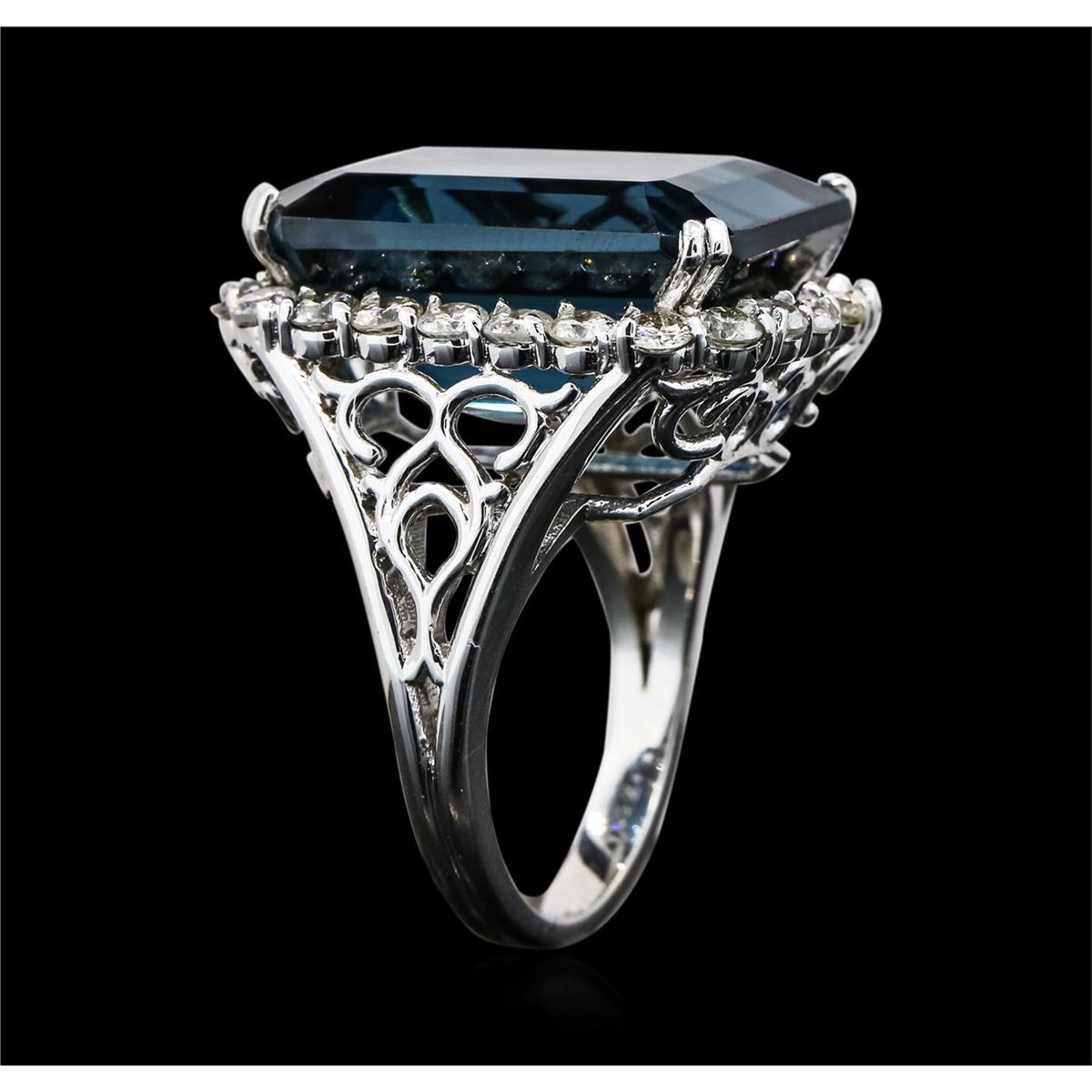 One electronically tested 14KT white gold ladies cast blue topaz and diamond ring with a bright polish finish. The featured blue topaz is set within a diamond bezel supported by tapering lattice design shoulders, completed by a grooved two and one-half millimeter wide band. Identified with markings of "585". Condition is new, good workmanship. Containing: One prong set rectangular step cut natural blue topaz, measuring 20.00 x 15.00 x 9.80mm, approximate weight of 31.13ct., clarity is eye clean, type I, dark, moderately strong, greenish blue color, (GIA gB 7/4), cut is good. Transmitting light with no distortion, transparent. Graded in the setting. A deposit of a thin layer has been applied to the topaz to produce the intense color effect. The process utilizes a very high temperature treatment, diffusion of ions into the topaz, plus in some cases neutron bombardment has been used to create the color center. Diffusion processes causes the added ions to become part of the crystal surface with no distinct boundary. Do not put a gem treated in this manner into an ultrasonic cleaner. Twenty-Four prong set round brilliant cut diamonds, measuring 2.70 - 2.60 x 1.59mm (depth est.) approximate total weight of 24 Stones = 1.73ct. Graded in the setting. Clarity: SI-1 to I-1. Color: G - I. Total Weight of Colored Stones 31.13ct. Total Weight of Diamonds 1.73ct. Total Weight of Ring 13.82 grams. AIG Appraised at $7,055.00.