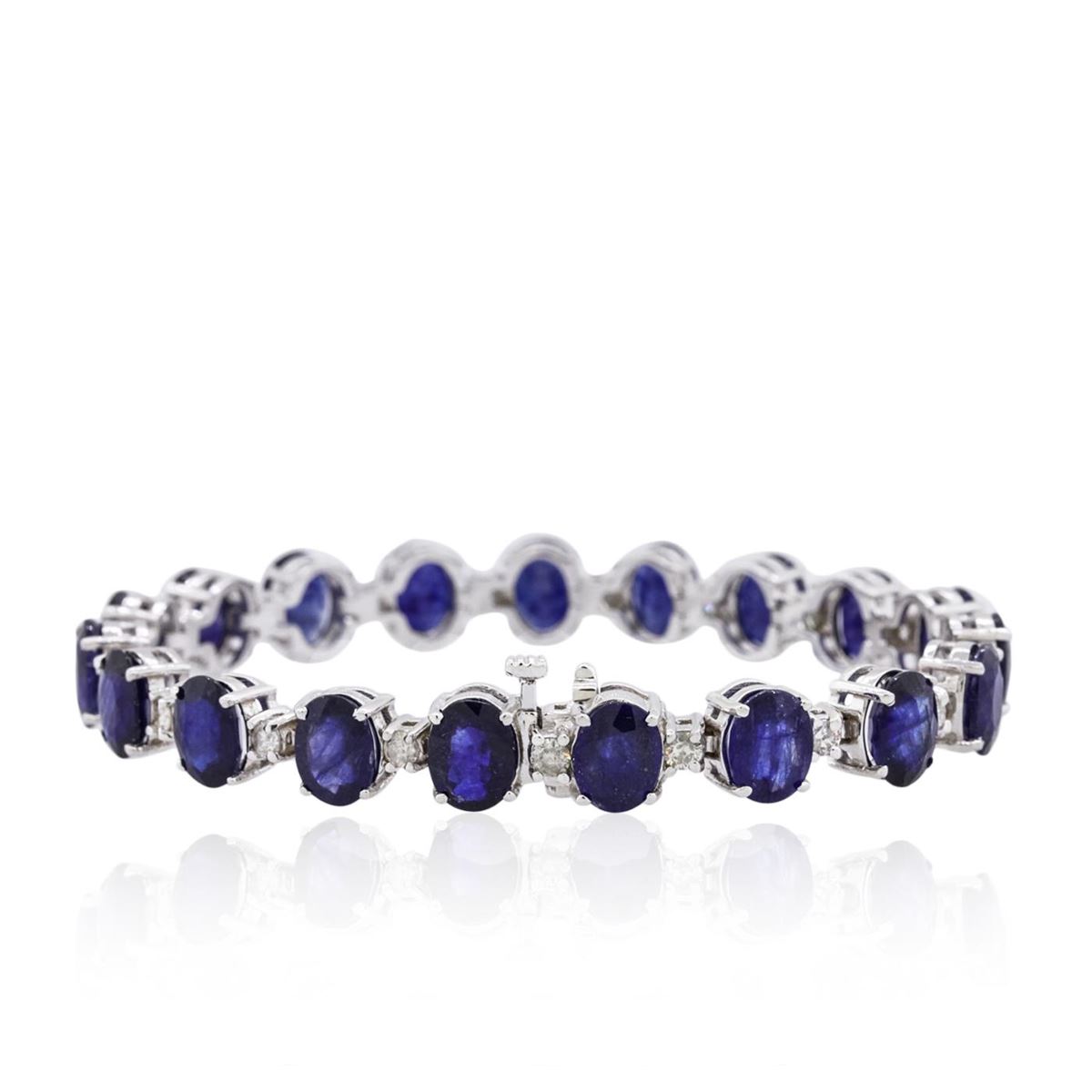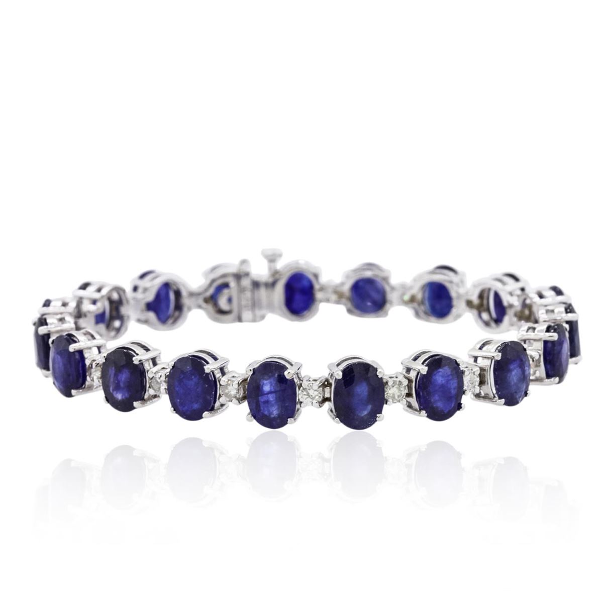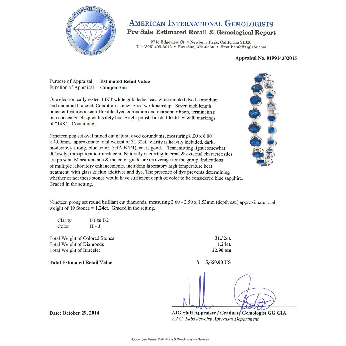 One electronically tested 14KT white gold ladies cast & assembled dyed corundum and diamond bracelet. Seven inch length bracelet features a semi-flexible dyed corundum and diamond ribbon, terminating in a concealed clasp with safety bar. Bright polish finish. Identified with markings of "14K". Condition is new, good workmanship. Containing: Nineteen peg set oval mixed cut natural dyed corundums, measuring 8.00 x 6.00 x 4.00mm, approximate total weight of 31.32ct., clarity is heavily included, dark, moderately strong, blue color, (GIA B 7/4), cut is good. Transmitting light somewhat diffusely, transparent to translucent. Naturally occurring internal & external characteristics are present. Measurements & the color grade are an average for the group. Indications of multiple laboratory enhancements, including laboratory high temperature heat treatment, with glass & flux additives and dye. The presence of dye prevents determining whether or not these stones would have sufficient depth of color to be considered blue sapphire. Graded in the setting. Nineteen prong set round brilliant cut diamonds, measuring 2.60 - 2.50 x 1.53mm (depth est.) approximate total weight of 19 Stones = 1.24ct. Graded in the setting. Clarity: I-1 to I-2. Color: H - J. Total Weight of Colored Stones 31.32ct. Total Weight of Diamonds 1.24ct. Total Weight of Bracelet 22.90 grams. AIG Appraised at $5,650.00.