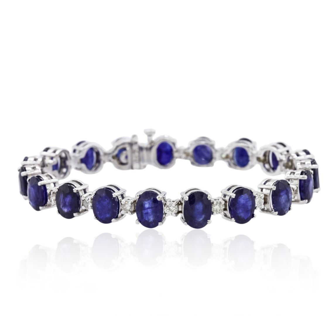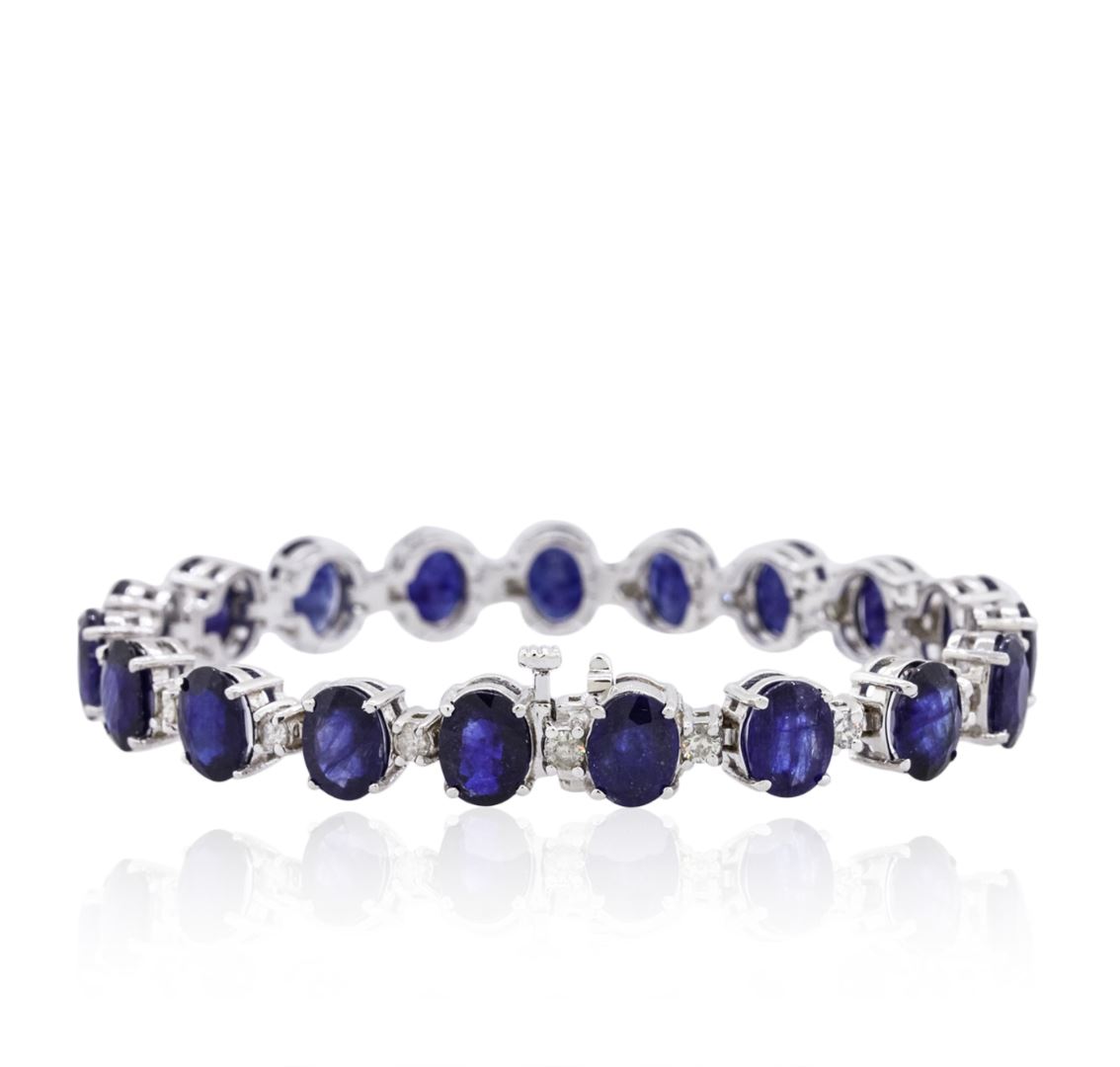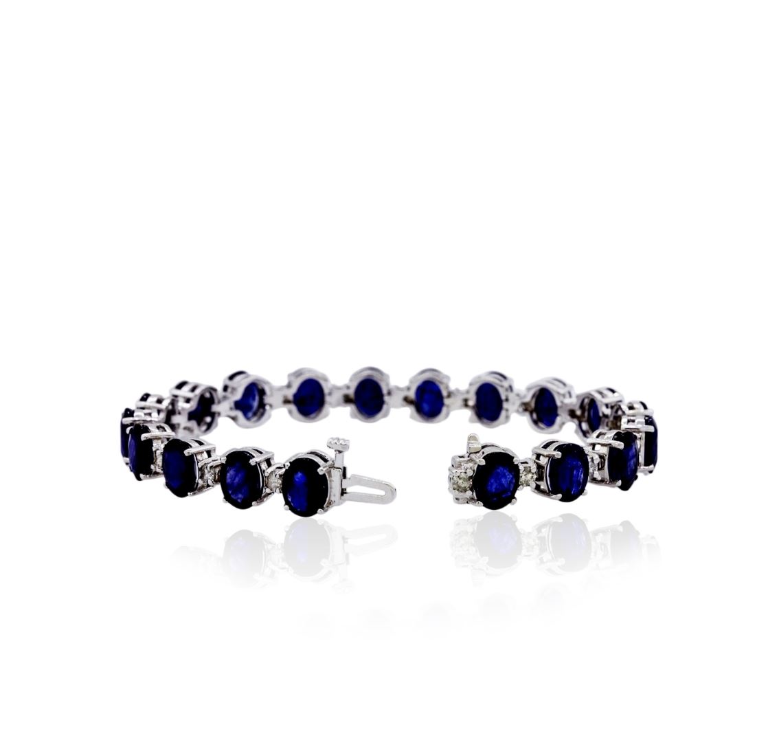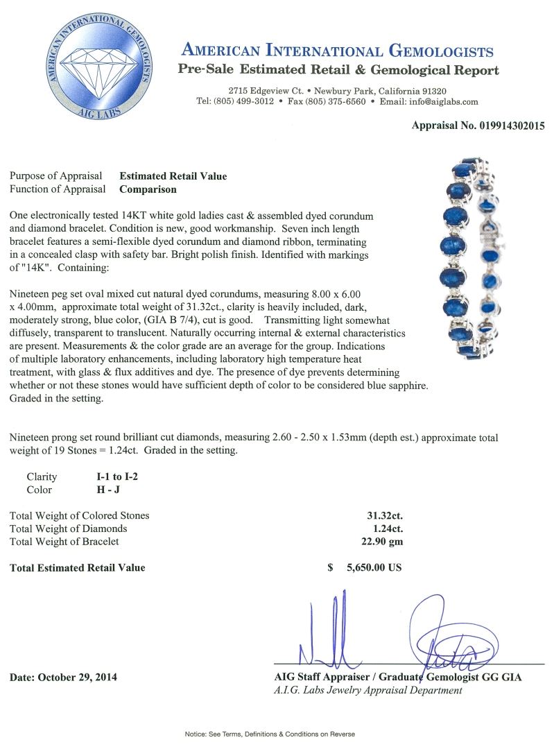 One electronically tested 14KT white gold ladies cast & assembled dyed corundum and diamond bracelet. Seven inch length bracelet features a semi-flexible dyed corundum and diamond ribbon, terminating in a concealed clasp with safety bar. Bright polish finish. Identified with markings of "14K". Condition is new, good workmanship. Containing: Nineteen peg set oval mixed cut natural dyed corundums, measuring 8.00 x 6.00 x 4.00mm, approximate total weight of 31.32ct., clarity is heavily included, dark, moderately strong, blue color, (GIA B 7/4), cut is good. Transmitting light somewhat diffusely, transparent to translucent. Naturally occurring internal & external characteristics are present. Measurements & the color grade are an average for the group. Indications of multiple laboratory enhancements, including laboratory high temperature heat treatment, with glass & flux additives and dye. The presence of dye prevents determining whether or not these stones would have sufficient depth of color to be considered blue sapphire. Graded in the setting. Nineteen prong set round brilliant cut diamonds, measuring 2.60 - 2.50 x 1.53mm (depth est.) approximate total weight of 19 Stones = 1.24ct. Graded in the setting. Clarity: I-1 to I-2. Color: H - J. Total Weight of Colored Stones 31.32ct. Total Weight of Diamonds 1.24ct. Total Weight of Bracelet 22.90 grams. AIG Appraised at $5,650.00.