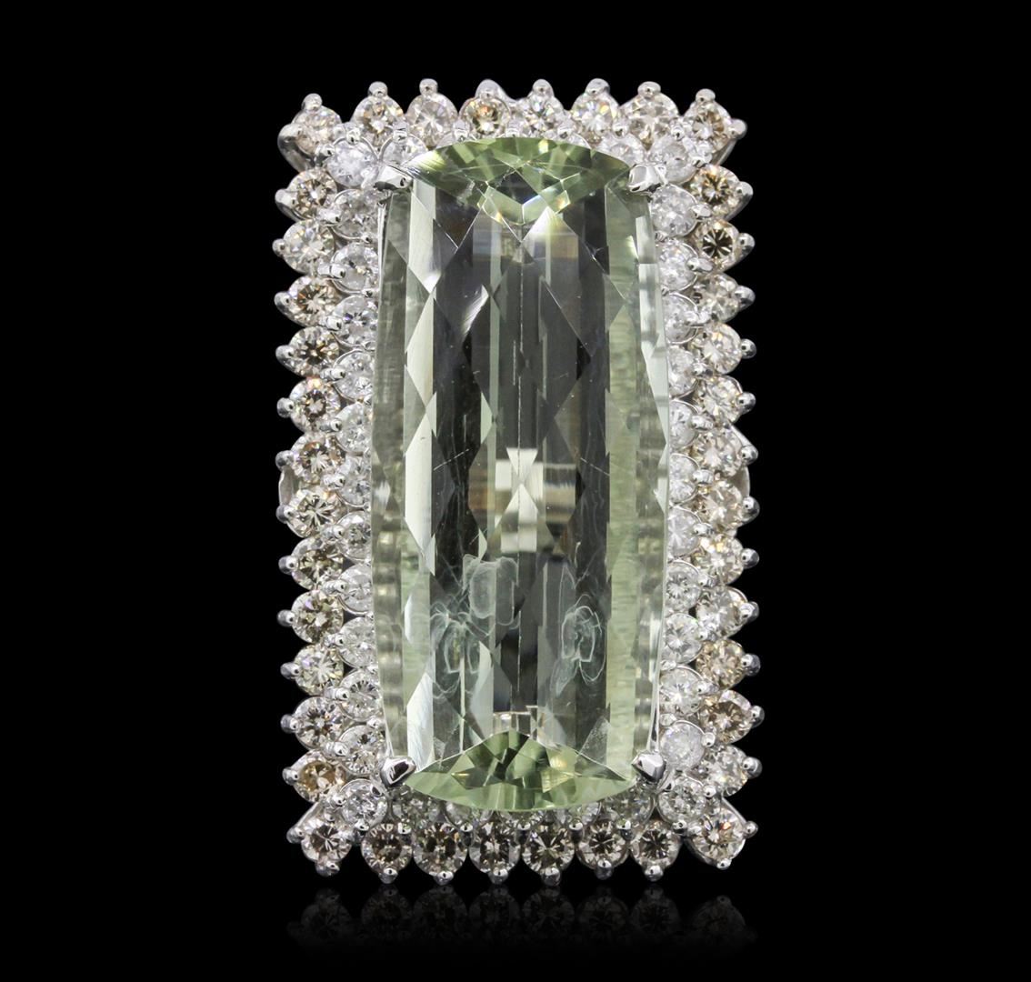 One electronically tested 14KT white gold ladies cast green quartz and diamond ring with a bright polish finish. Condition is new, good workmanship. The featured green quartz is set within two tiered diamond bezels, completed by a three and one-half millimeter wide band. Identified with markings of "K14". Containing: One prong set rectangular cushion mixed cut natural green quartz, measuring 33.50 x 14.50 x 9.45mm, 10%. bulge factor, approximate weight of 31.56ct., clarity is eye clean, medium, very slightly grayish, slightly yellowish green color, (GIA slyG 5/3), cut is good. Transmitting light with no distortion, transparent. Graded in the setting. Forty prong set round brilliant cut diamonds, measuring 2.80 - 2.70 x 1.65mm (depth est.) approximate. Total Weight of 40 Stones = 3.14ct. Color grade is an average for the group. Graded in the setting. Clarity: SI-1 to I-1 Thirty-Six prong set round brilliant cut diamonds, measuring 2.40 - 2.30 x 1.41mm (depth est.) approximate. Total Weight of 36 Stones = 1.81ct. Graded in the setting. Clarity: I-1 to I-2. Color: G - I. Total Weight of Colored Stones 31.56ct. Total Weight of Diamonds 4.95ct. Total Weight of Ring 24.80 grams. AIG Appraised at $14,645.00.