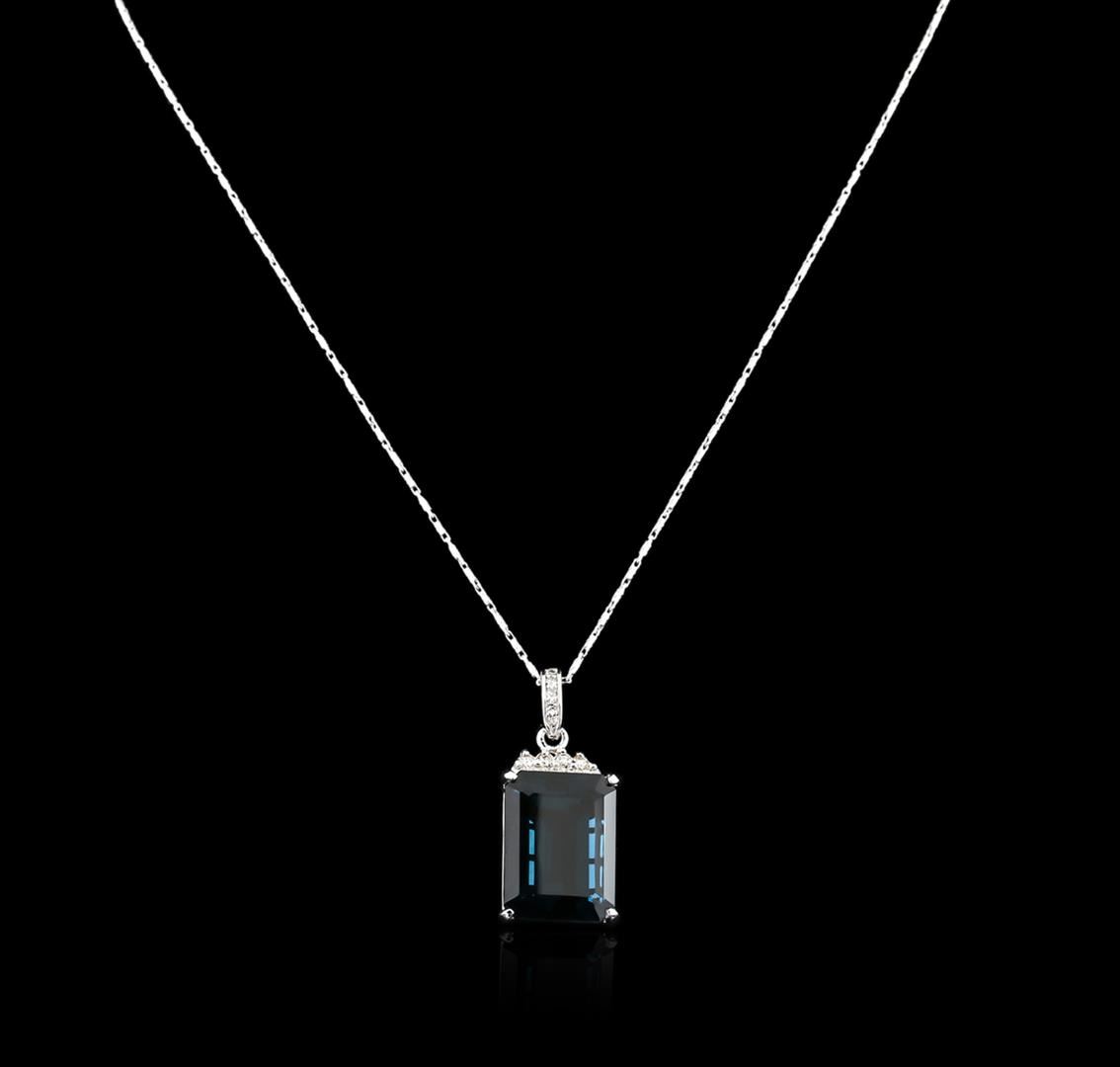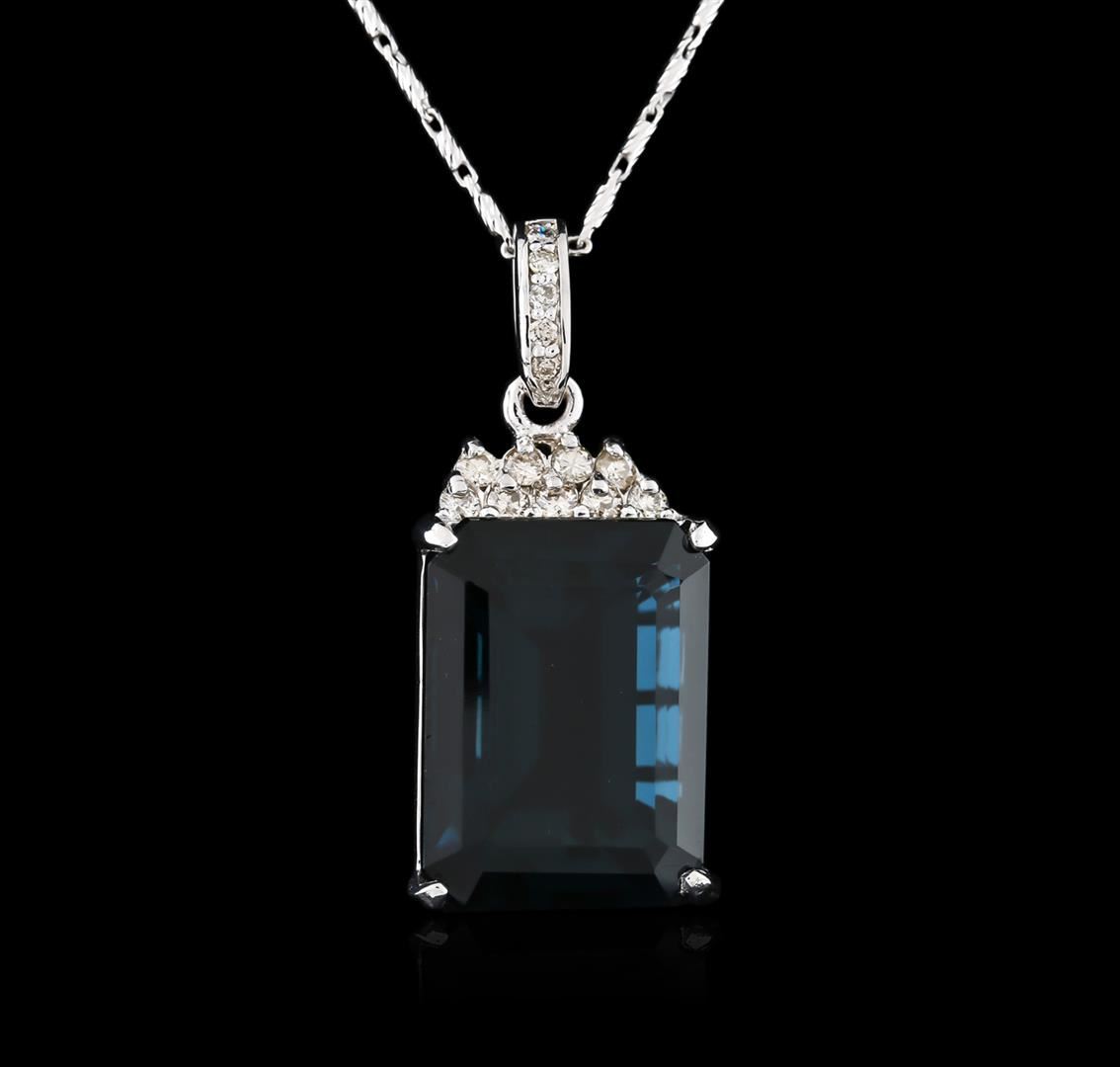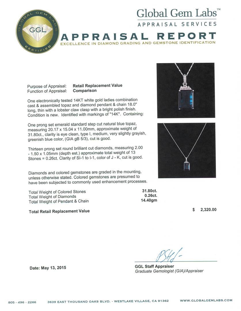 One electronically tested 14KT white gold ladies combination cast & assembled topaz and diamond pendant & chain 18.0" long, thin with a lobster claw clasp with a bright polish finish. Identified with markings of "14K". Condition is new. Containing: One prong set emerald standard step cut natural blue topaz, measuring 20.17 x 15.04 x 11.00mm, approximate weight of 31.80ct., clarity is eye clean, type I, medium, very slightly grayish, greenish blue color, (GIA gB 5/3), cut is good. Thirteen prong set round brilliant cut diamonds, measuring 2.00 - 1.50 x 1.05mm (depth est.) approximate total weight of 13 Stones = 0.26ct. Clarity: SI-1 to I-1. Color: J - K, Cut is Good. Diamonds and colored gemstones are graded in the mounting, unless otherwise stated. Colored gemstones are presumed to have been subjected to commonly used enhancement processes. Total Weight of Colored Stones 31.80ct. Total Weight of Diamonds 0.26ct. Total Weight of Pendant & Chain 14.40 grams. GGL Appraised at $2,320.00.