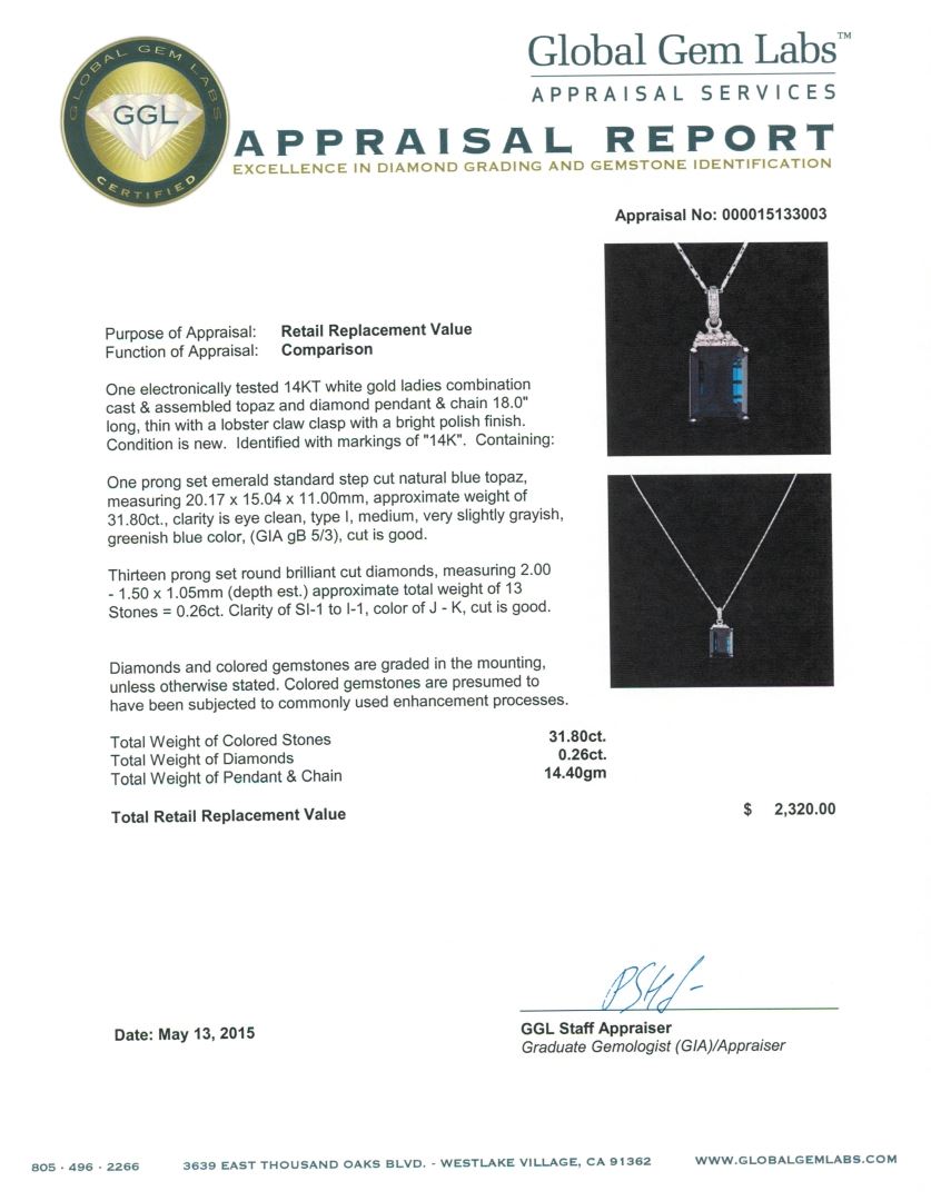 One electronically tested 14KT white gold ladies combination cast & assembled topaz and diamond pendant & chain 18.0" long, thin with a lobster claw clasp with a bright polish finish. Identified with markings of "14K". Condition is new. Containing: One prong set emerald standard step cut natural blue topaz, measuring 20.17 x 15.04 x 11.00mm, approximate weight of 31.80ct., clarity is eye clean, type I, medium, very slightly grayish, greenish blue color, (GIA gB 5/3), cut is good. Thirteen prong set round brilliant cut diamonds, measuring 2.00 - 1.50 x 1.05mm (depth est.) approximate total weight of 13 Stones = 0.26ct. Clarity: SI-1 to I-1. Color: J - K, Cut is Good. Diamonds and colored gemstones are graded in the mounting, unless otherwise stated. Colored gemstones are presumed to have been subjected to commonly used enhancement processes. Total Weight of Colored Stones 31.80ct. Total Weight of Diamonds 0.26ct. Total Weight of Pendant & Chain 14.40 grams. GGL Appraised at $2,320.00.