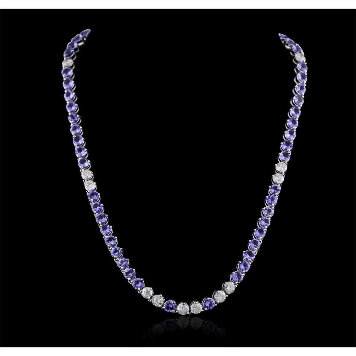 One electronically tested 14KT white gold Ladies combination cast & assembled necklace with a hidden box clasp with a bright polish finish. Condition is new. Measurements: 16.5" in length. Identified with markings of "14K". Containing: Fifty-eight prong set round modified brilliant cut natural tanzanites, measuring 5.00 - 5.00 x 3.26 mm, approximate. Total Weight of 31.90ct., clarity is eye clean, type I, medium light, very slightly grayish, bluish violet color, (GIA bV 4/3), cut is good. Twelve prong set round brilliant cut diamonds, measuring 5.10 - 5.10 x 3.06mm (depth est.) approximate. Total Weight of 12 Stones = 5.83ct. Clarity: I-2 to I-3. Color: I - J, Cut is Good. Colored gemstones are presumed to have been subjected to commonly used enhancement processes. All diamonds and colored gemstones are graded in the mounting, unless otherwise stated. Total Weight of Colored Stones 31.90ct. Total Weight of Diamonds 5.83ct. Total Weight of Necklace 38.10 grams. GGL Appraised at $44,370.00.