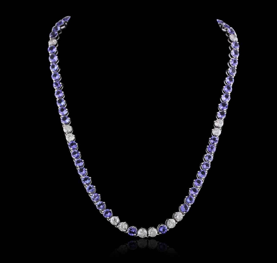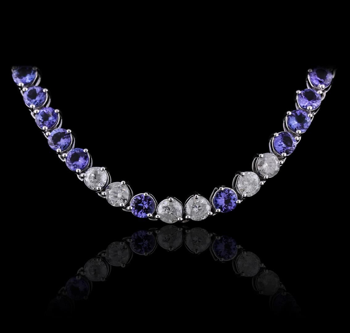 One electronically tested 14KT white gold Ladies combination cast & assembled necklace with a hidden box clasp with a bright polish finish. Condition is new. Measurements: 16.5" in length. Identified with markings of "14K". Containing: Fifty-eight prong set round modified brilliant cut natural tanzanites, measuring 5.00 - 5.00 x 3.26 mm, approximate. Total Weight of 31.90ct., clarity is eye clean, type I, medium light, very slightly grayish, bluish violet color, (GIA bV 4/3), cut is good. Twelve prong set round brilliant cut diamonds, measuring 5.10 - 5.10 x 3.06mm (depth est.) approximate. Total Weight of 12 Stones = 5.83ct. Clarity: I-2 to I-3. Color: I - J, Cut is Good. Colored gemstones are presumed to have been subjected to commonly used enhancement processes. All diamonds and colored gemstones are graded in the mounting, unless otherwise stated. Total Weight of Colored Stones 31.90ct. Total Weight of Diamonds 5.83ct. Total Weight of Necklace 38.10 grams. GGL Appraised at $44,370.00.