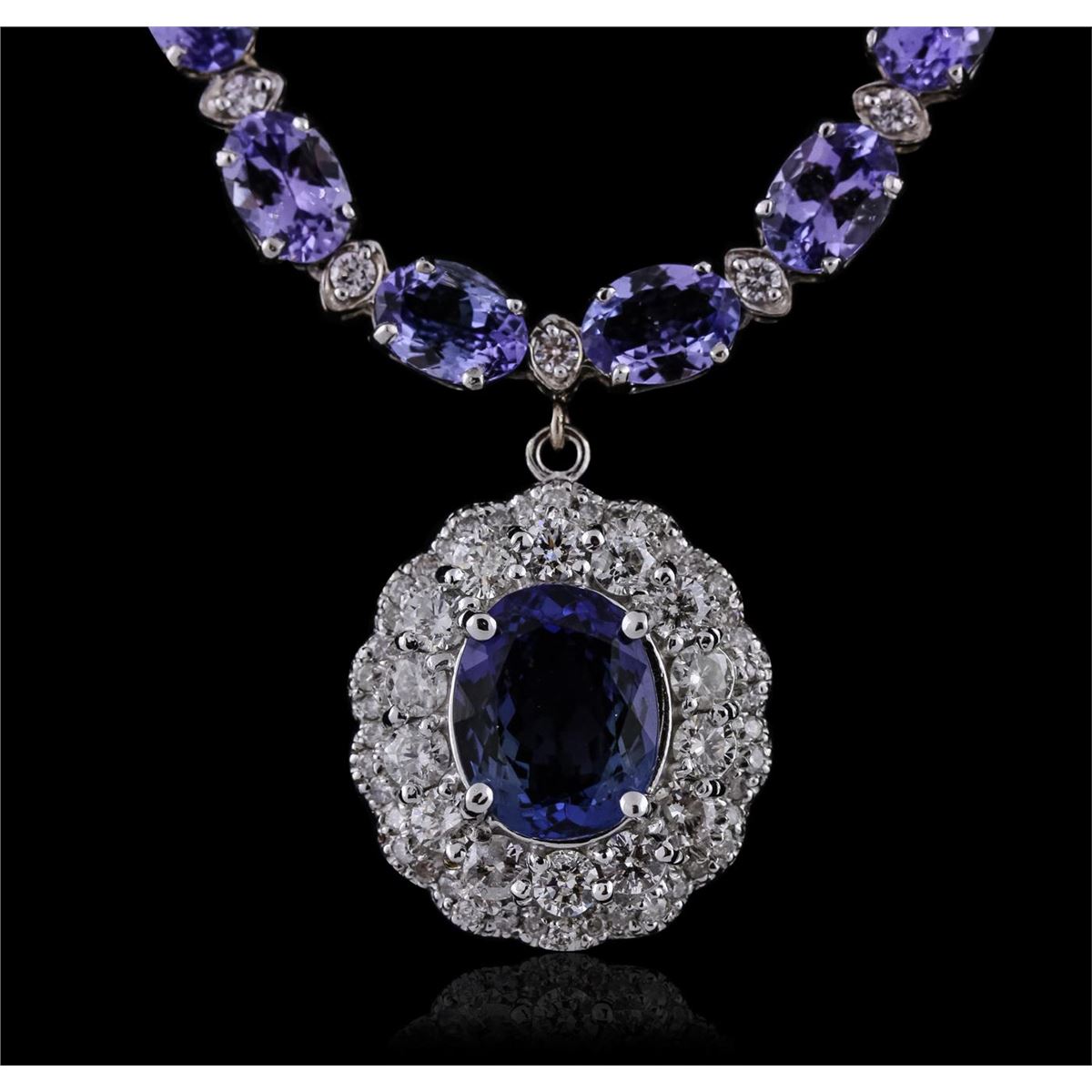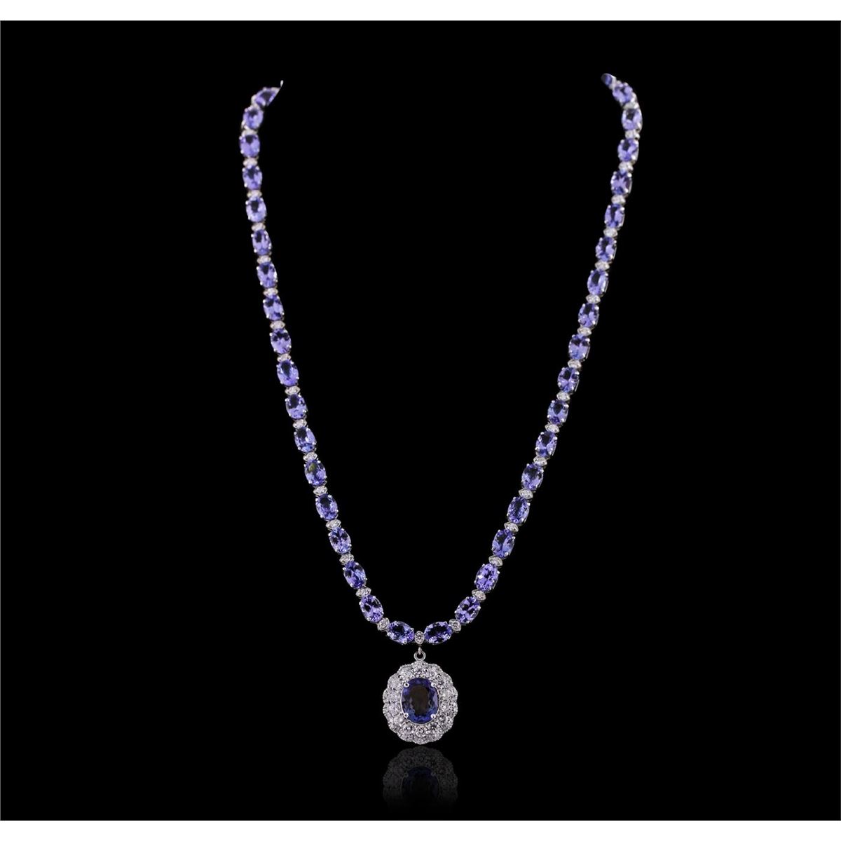 One electronically tested 14KT white gold ladies cast & assembled tanzanite and diamond necklace with a bright polish finish. Seventeen inch length necklace features a tanzanite and diamond pendant supported by a flexible tanzanite and diamond ribbon, terminating in a concealed clasp with safety. Identified with markings of "14K". Condition is new, good workmanship. Containing: One prong set oval mixed cut natural tanzanite, measuring 10.80 x 8.60 x 5.00.mm, 6%. bulge factor, approximate weight of 3.34ct., clarity is eye clean, type I, medium dark, very slightly grayish, violetish blue color, (GIA vB 6/3), cut is good. Transmitting light with no distortion, transparent. Graded in the setting. Forty-six prong set oval mixed cut natural tanzanites, measuring 6.50 x 5.00. x 2.80mm, approximate total weight of 28.62ct., clarity is eye clean, type I, medium dark, very slightly grayish, bluish violet color, (GIA bV 6/3), cut is good. Transmitting light with no distortion, transparent. Measurements & the color grade are an average for the group. Graded in the setting. Tanzanite is a very rare gemstone that is only found in the country of Tanzania. Originally discovered in 1967. Tiffany & Company, named the stone Tanzanite. It is found in the Usumburu Mountains that border the Umba Valley of northern Tanzania. Tanzanite occurs in gray, brown, violet, blue, reddish-purple, & green. The gem is interesting because of its exceptional pleochroism. Rotated in different directions a tanzanite will exhibit multiple changes of color. Tanzanite has a low tolerance to ultrasonic cleaning, and should not be cleaned using this method. Fourteen prong set round brilliant cut diamonds, measuring 2.90 - 2.80 x 1.71mm (depth est.) approximate total weight of 14 Stones = 1.28ct. Graded in the setting. Clarity: SI-1 to I-1 . Color: G - I Forty-Six prong set round brilliant cut diamonds, measuring 2.00. - 1.90 x 1.17mm (depth est.) approximate total weight of 46 Stones = 1.34ct. Graded in the setting. Clarity: SI-1 to I-1 . Color: G - I Forty-Two prong set round brilliant cut diamonds, measuring 1.30 - 1.20 x 0.75mm (depth est.) approximate total weight of 42 Stones = 0.39ct. Graded in the setting. Clarity: SI-1 to I-1 . Color: G - I. Total Weight of Colored Stones 31.96ct. Total Weight of Diamonds 3.01ct. Total Weight of Necklace 29.10 grams. AIG Appraised at $40,880.00.